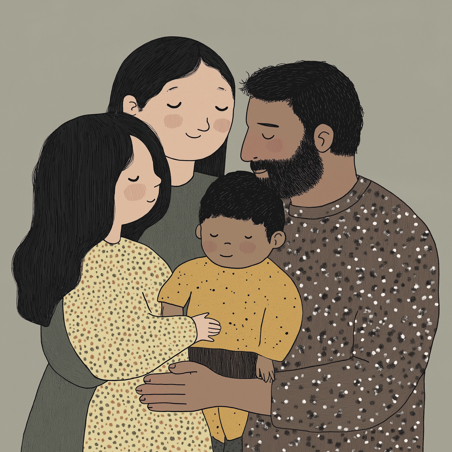 Illustration of a diverse family embracing, featuring warm colors and peaceful expressions, set against a muted gray background.