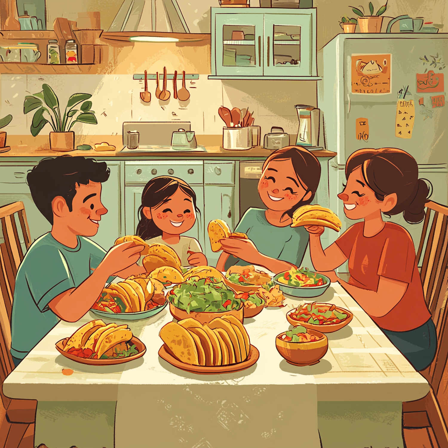 A family of four enjoys a taco meal in a cozy kitchen, surrounded by laughter and warmth. Light blue cabinets and plants add charm.
