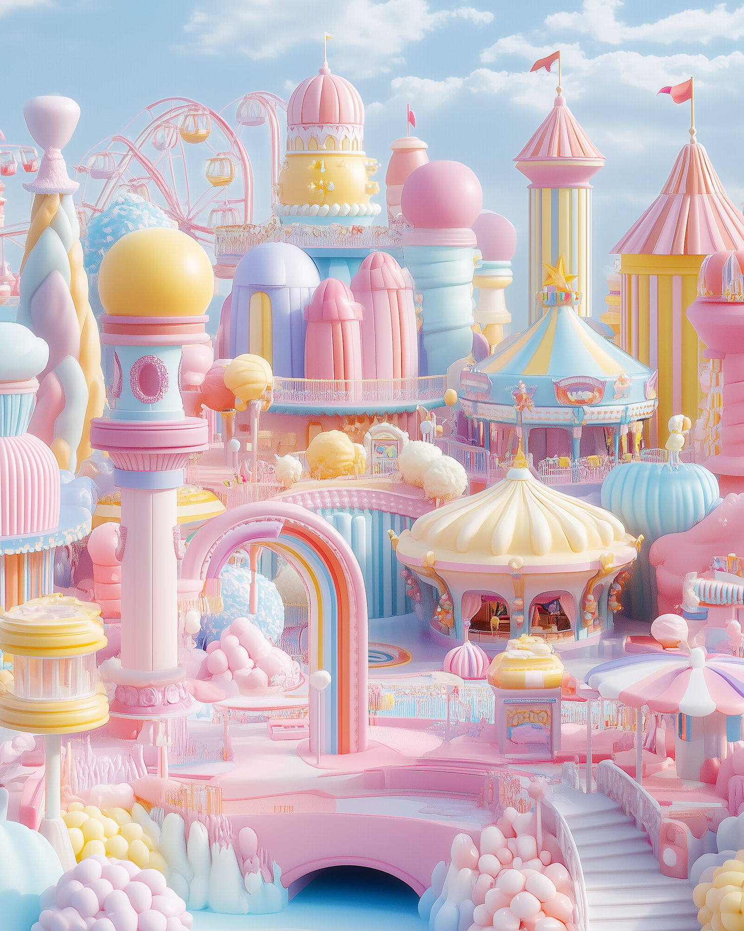 A pastel fantasy amusement park with a carousel, rainbow arch, and Ferris wheel, evoking a dreamy candyland vibe.