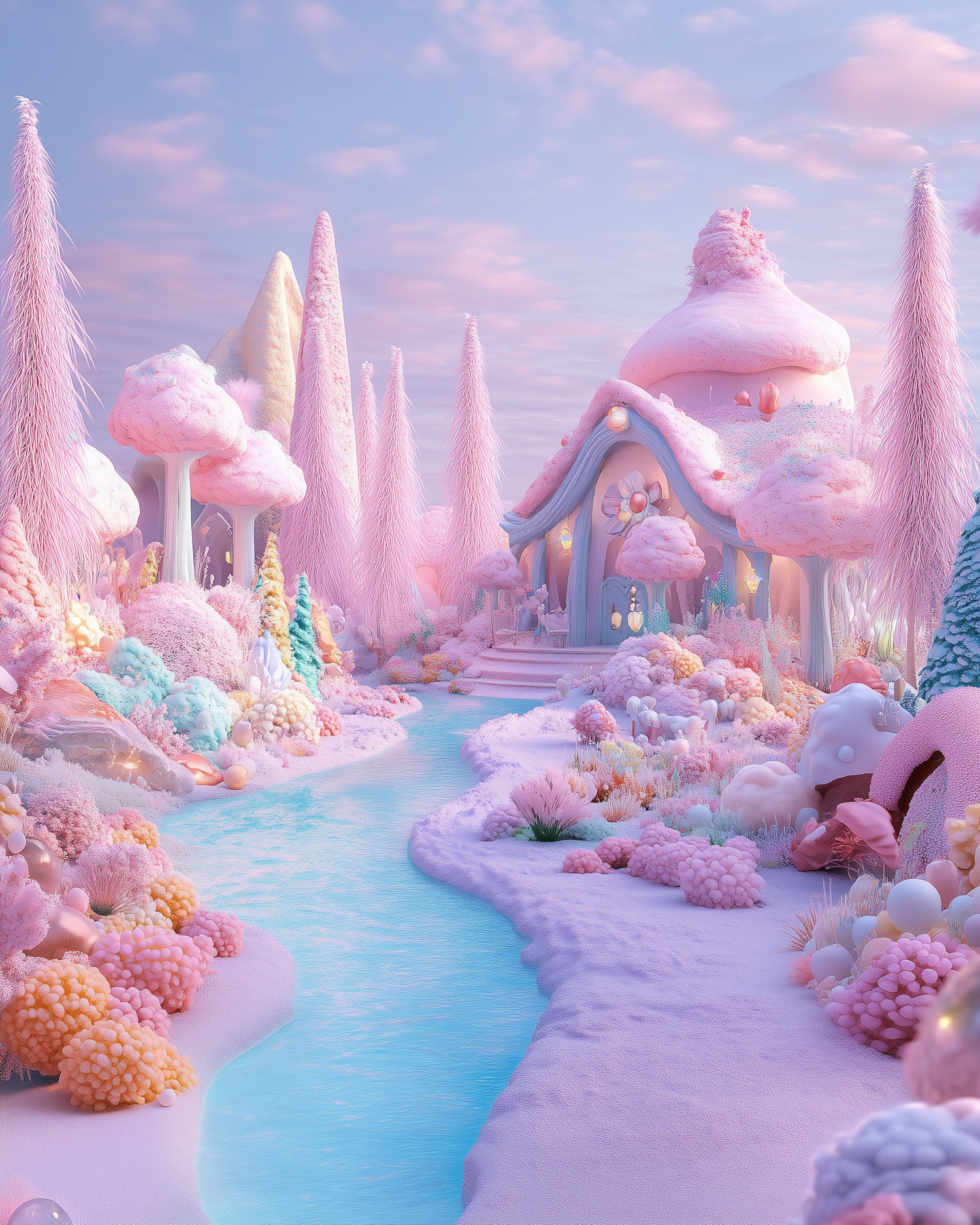 Step into a pastel dreamland with glowing rivers, candy-like trees, and a cozy fairy-tale house. Perfect for fantasy lovers!