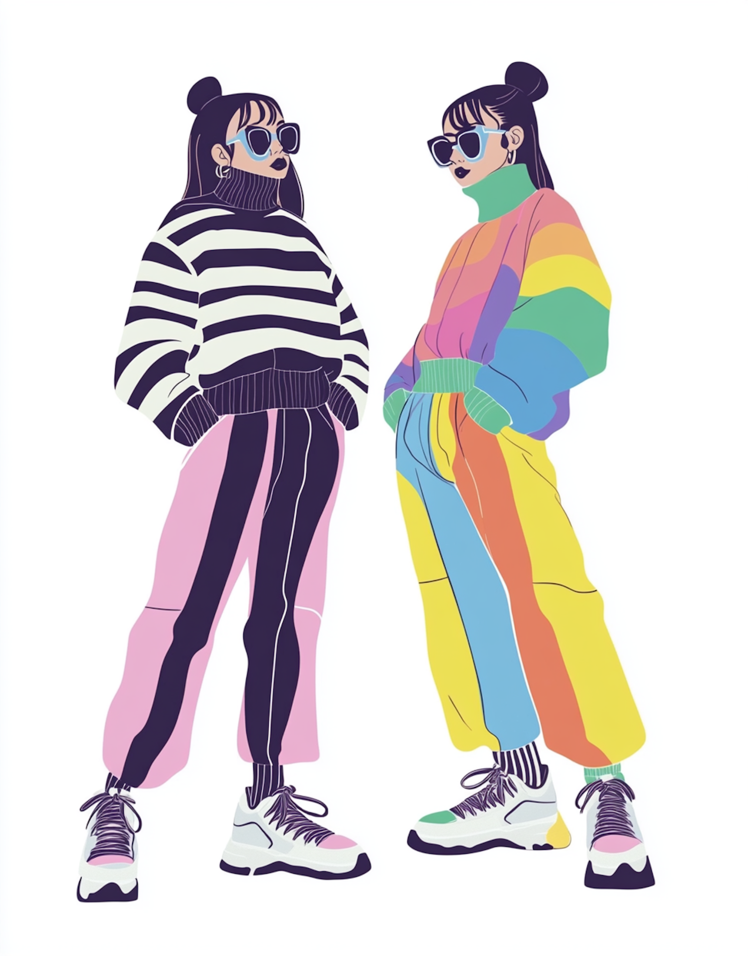 Two stylish figures in bold striped and rainbow outfits with sunglasses and sneakers, set against a white background.