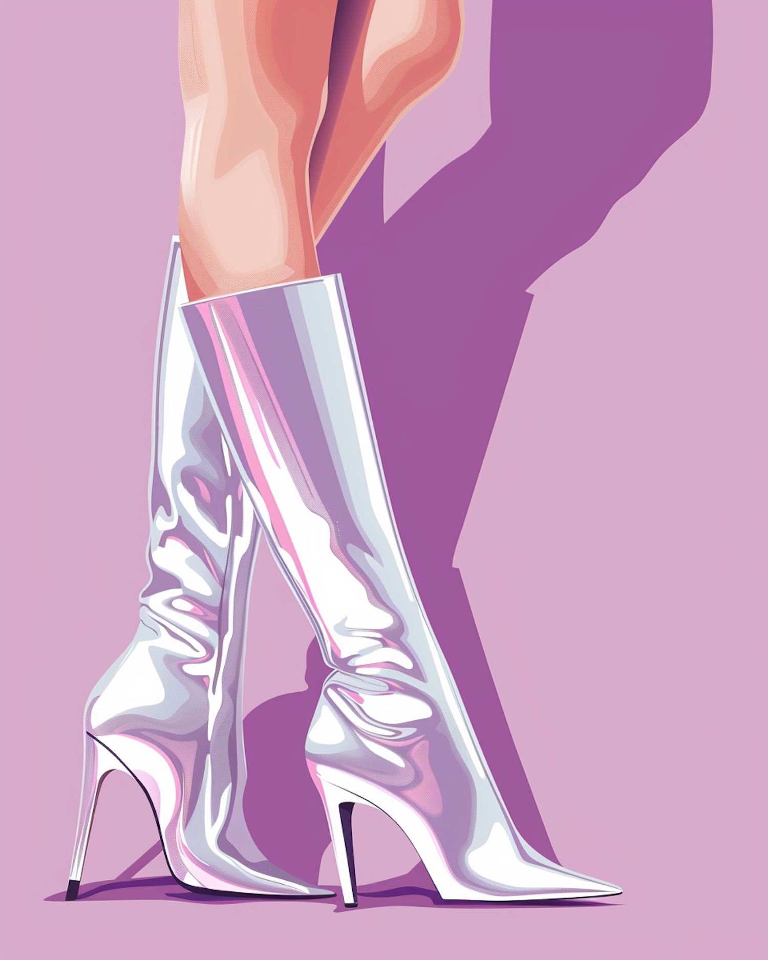 Stylish illustration of metallic white knee-high boots with stiletto heels on a lavender background, exuding modern elegance.