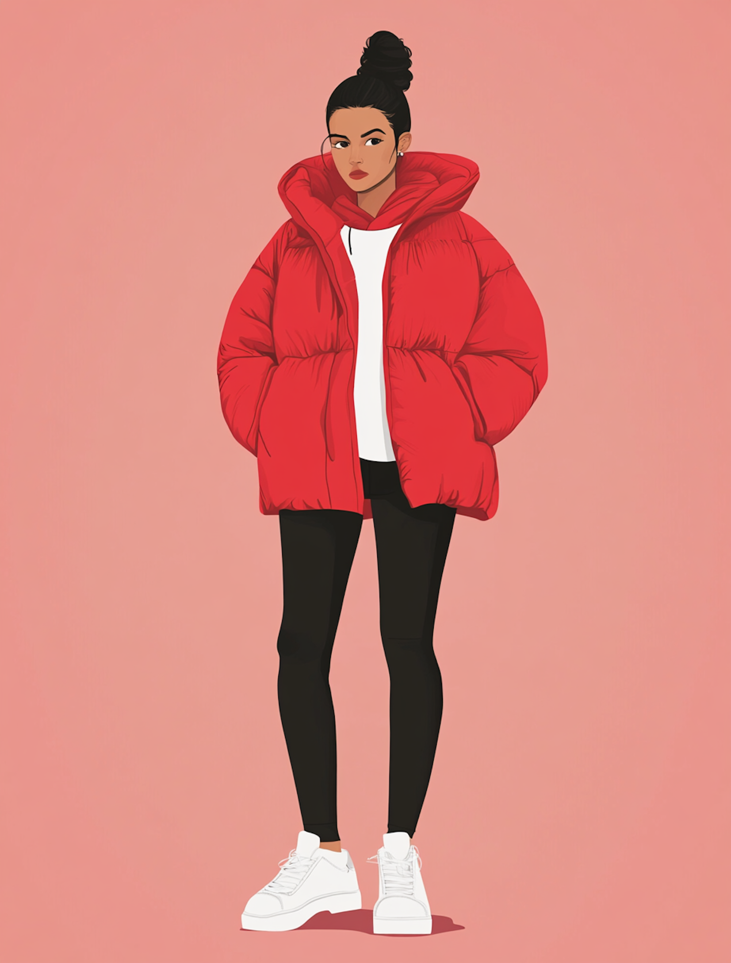 Illustration of a woman in a red puffer jacket, black leggings, and white sneakers against a pink background.