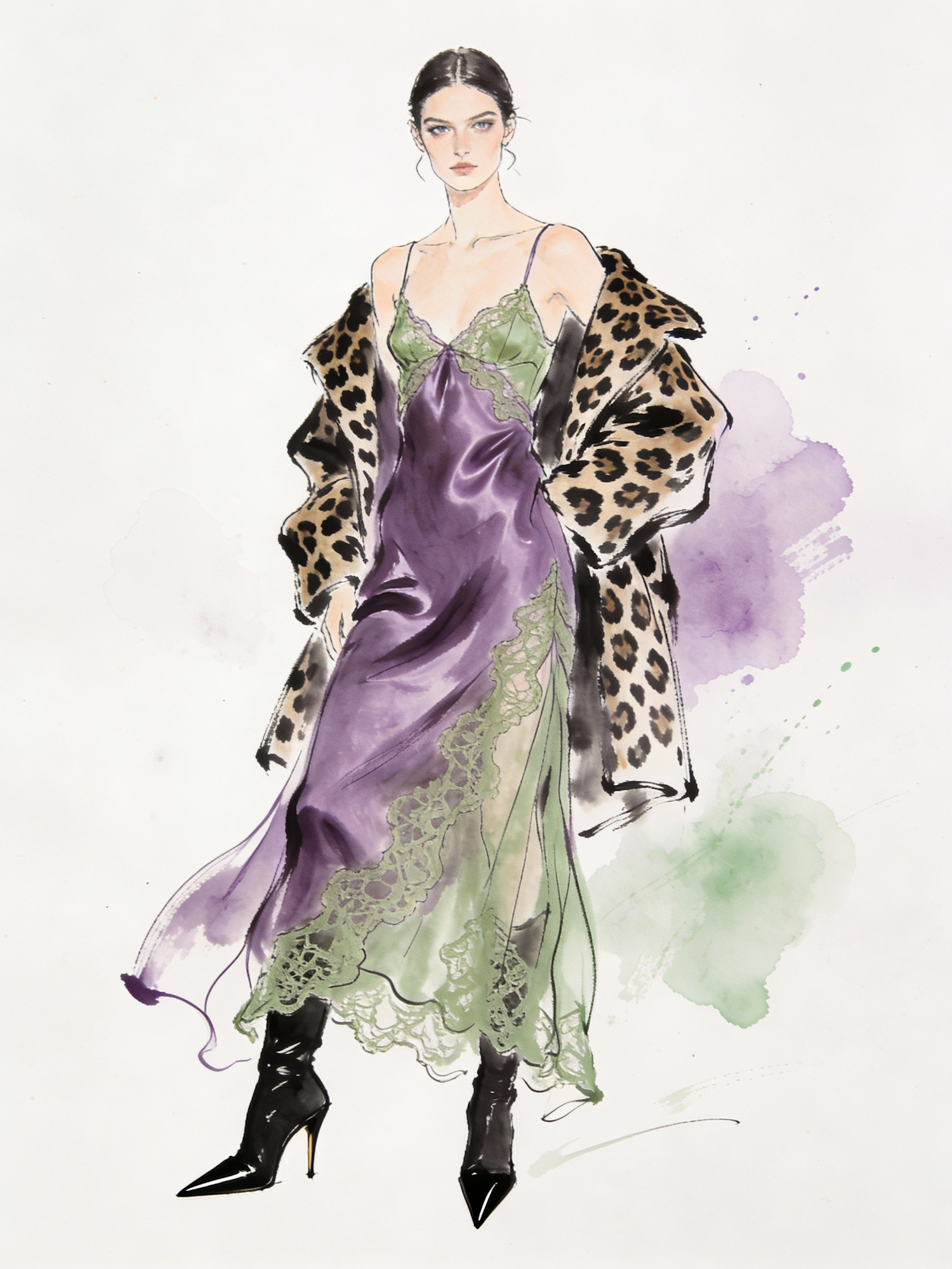 An abstract and minimal ink sketch of a fashion model with a leopard print coat, purple satin and sage green lace midi slip dress, black stiletto pointed-toe boots