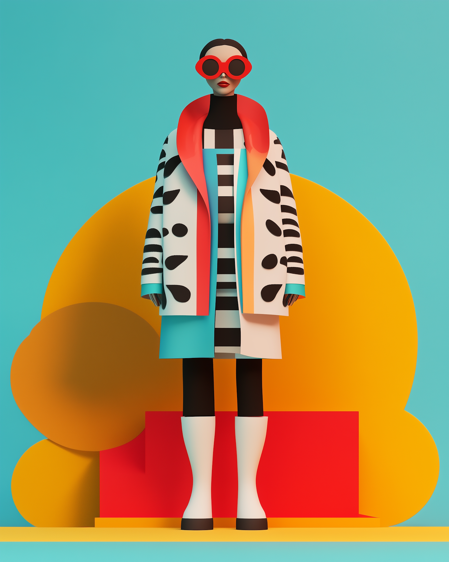 Bold fashion illustration with polka-dot coat, red sunglasses, and vibrant geometric background. Perfect for modern art and design lovers.
