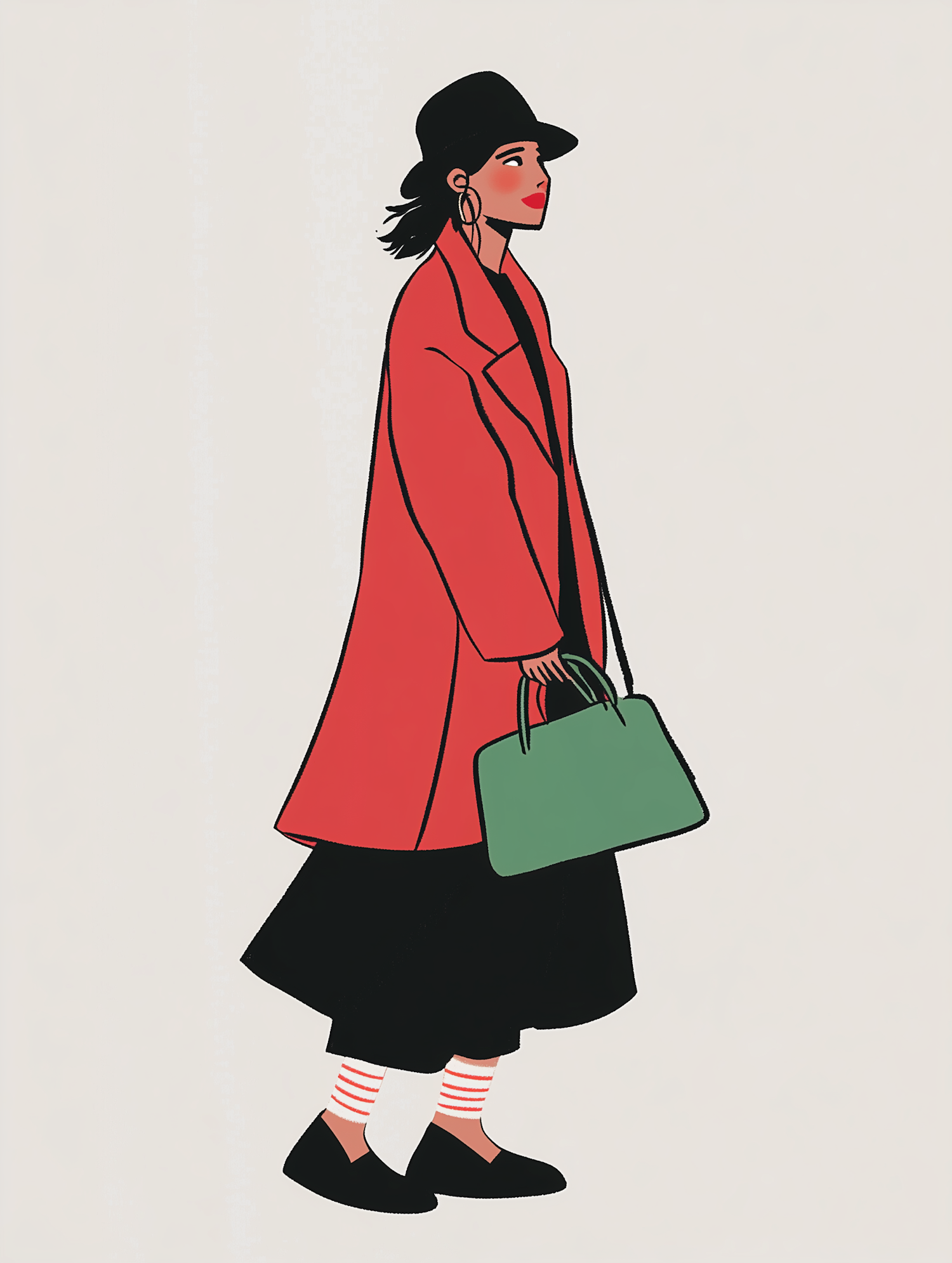 Stylish illustration of a woman in a red coat, black hat, and green handbag, exuding confidence and modern fashion.