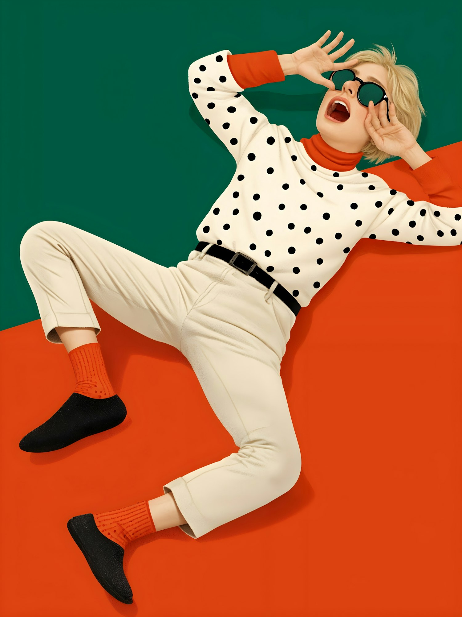 A stylish person in a polka dot sweater and orange socks lies on a bold orange and green backdrop, striking a fun pose.