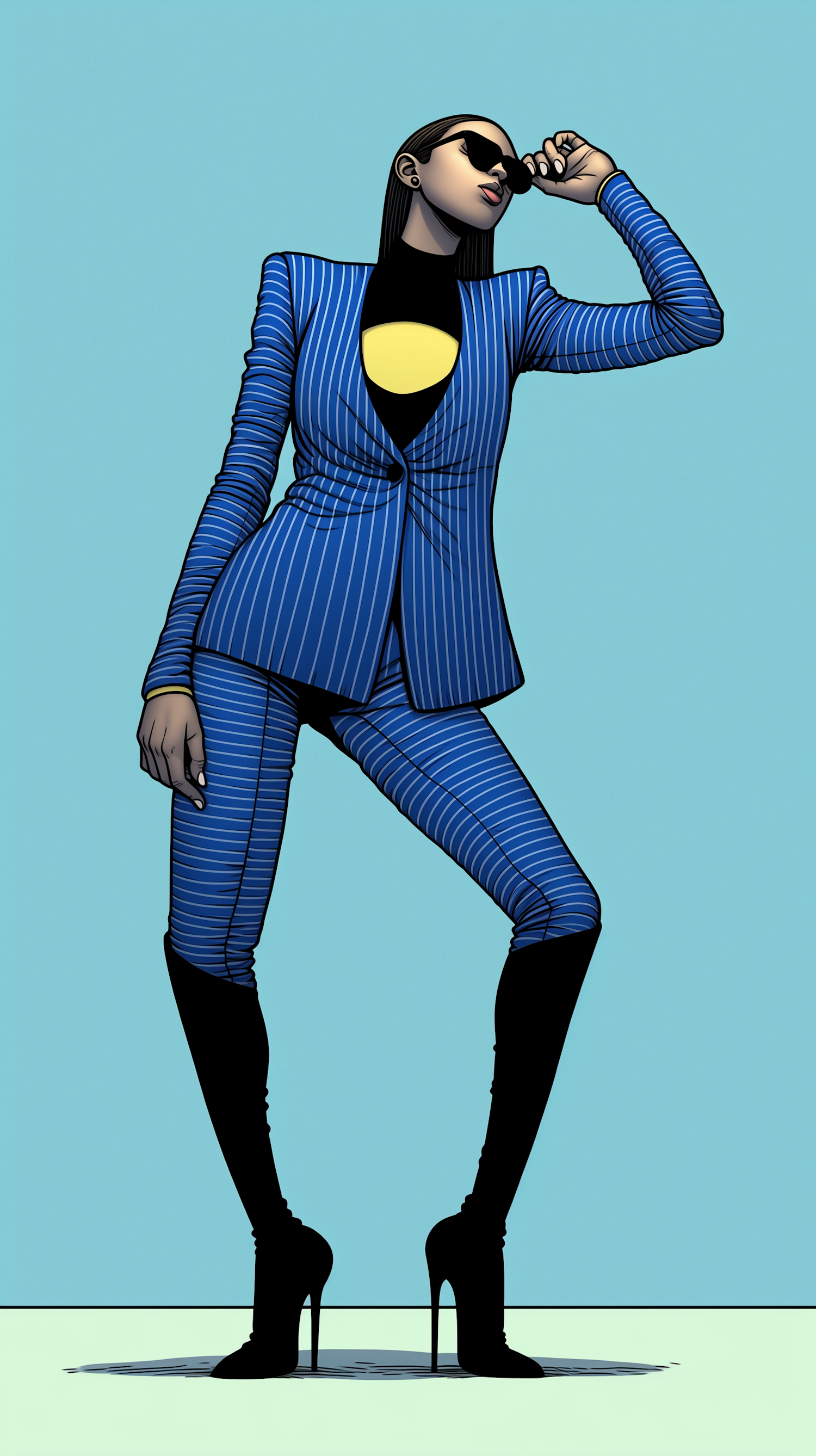 Stylish individual in a blue pinstripe suit and black boots, accessorized with sunglasses, against a clean light blue background.