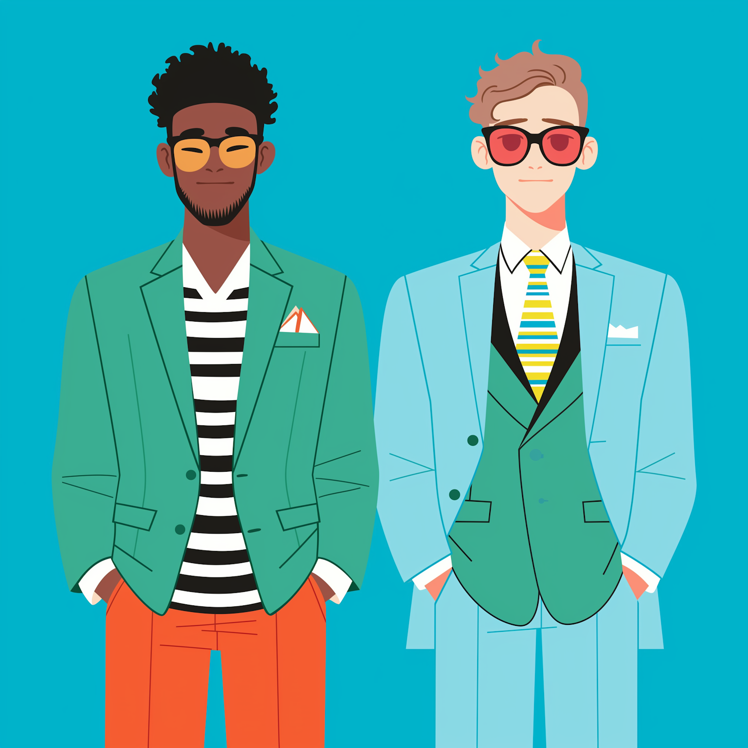 Stylish illustration of two men in colorful suits, one in green and orange, the other in blue and green, against a bright blue background.