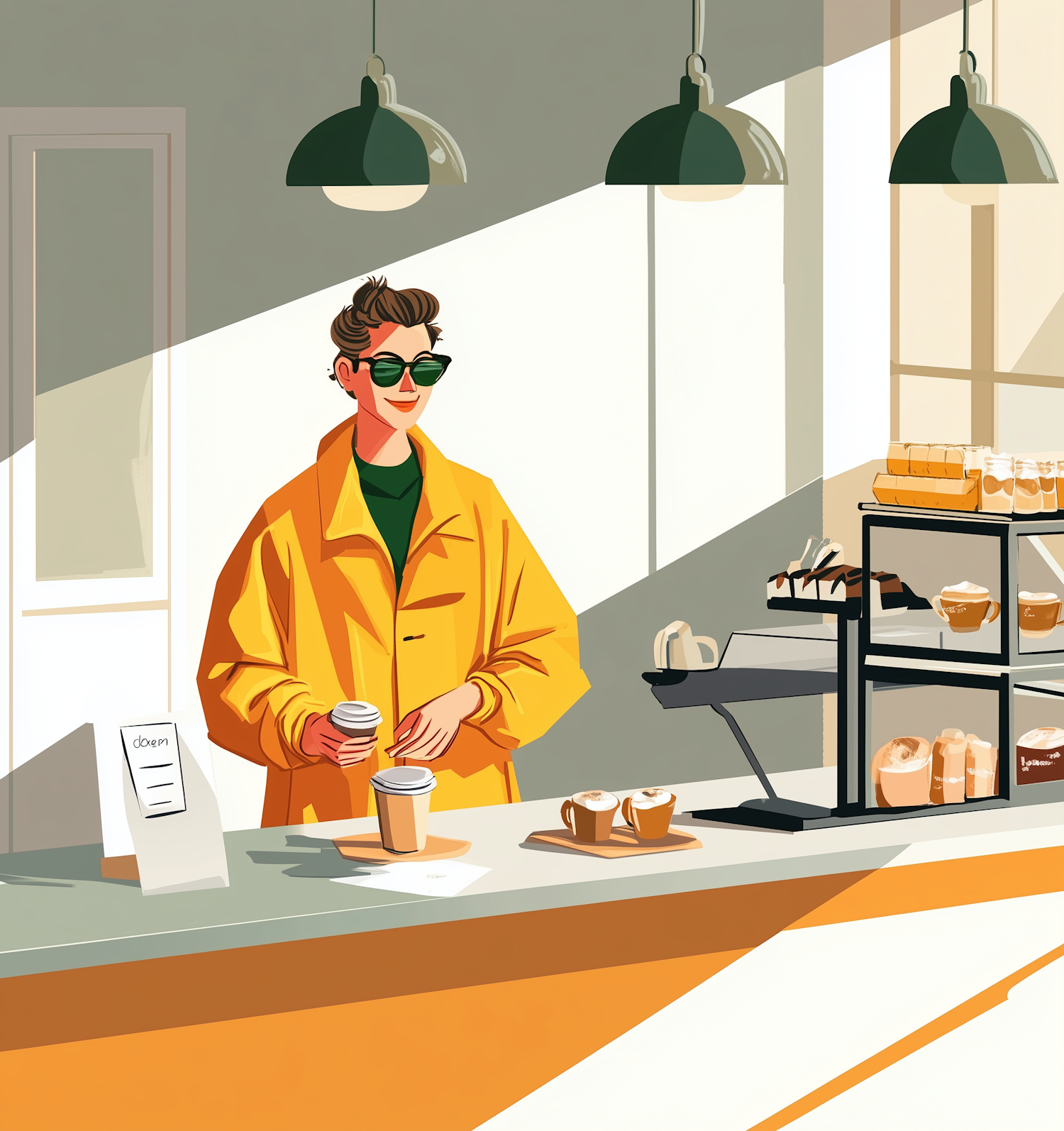 Chic café scene with a person in a yellow coat and sunglasses, surrounded by pastries and coffee under stylish lighting.