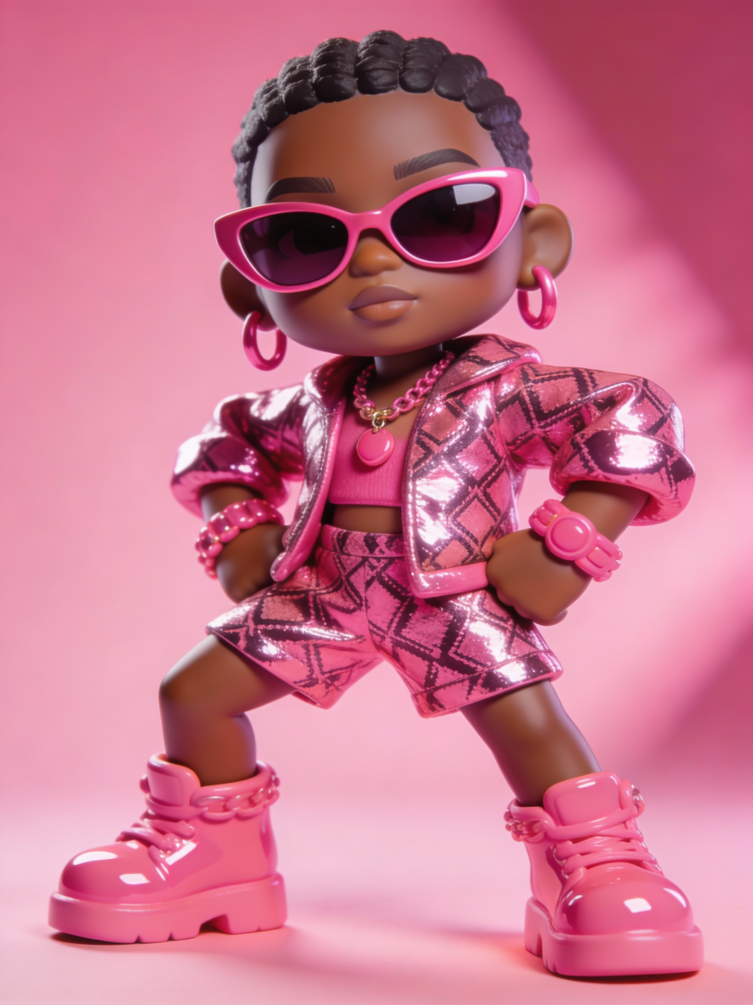 A fashionable doll in a pink outfit and accessories, striking a confident pose against a matching pink background.