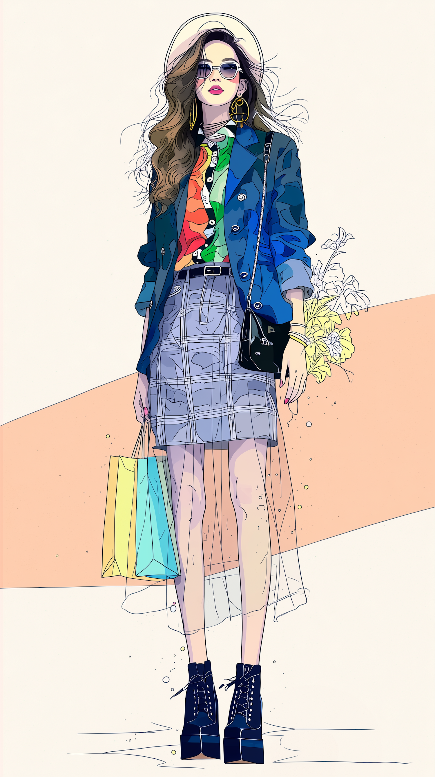 Stylish illustration of a woman in vibrant attire with shopping bags, showcasing modern fashion and accessories in a colorful setting.