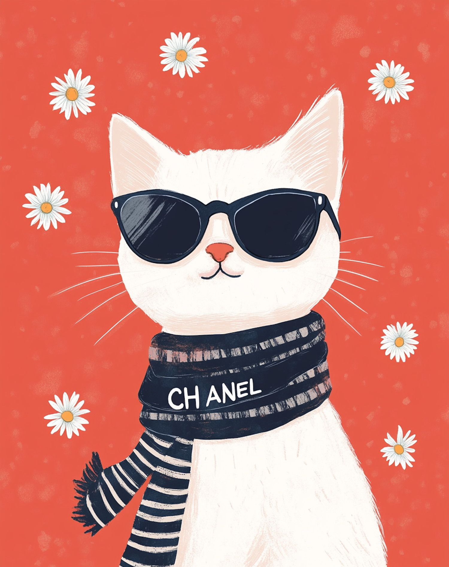 Chic white cat in sunglasses and Chanel scarf on orange background with daisies. Trendy and playful illustration.