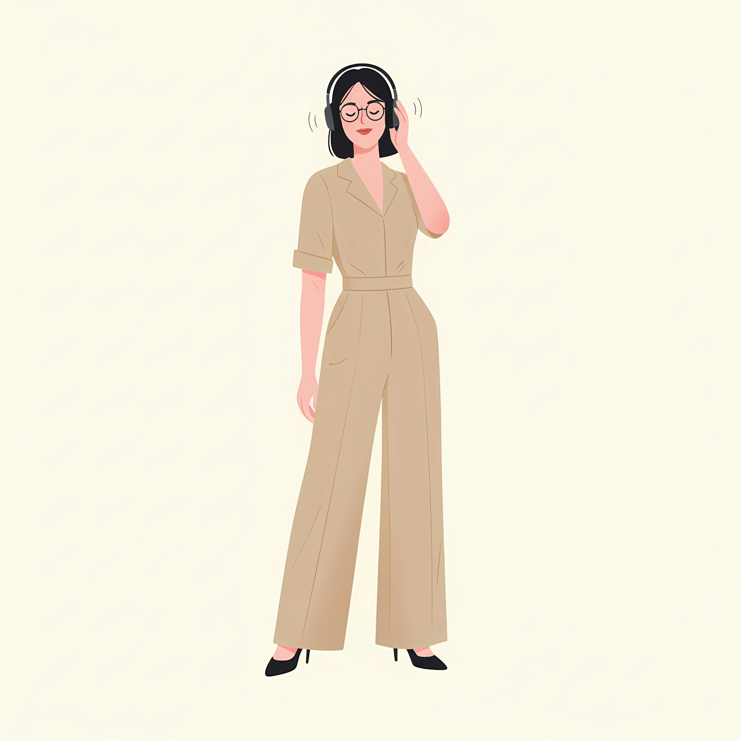 Illustration of a woman in a beige jumpsuit with headphones, enjoying music. Modern and stylish design on a light cream background.