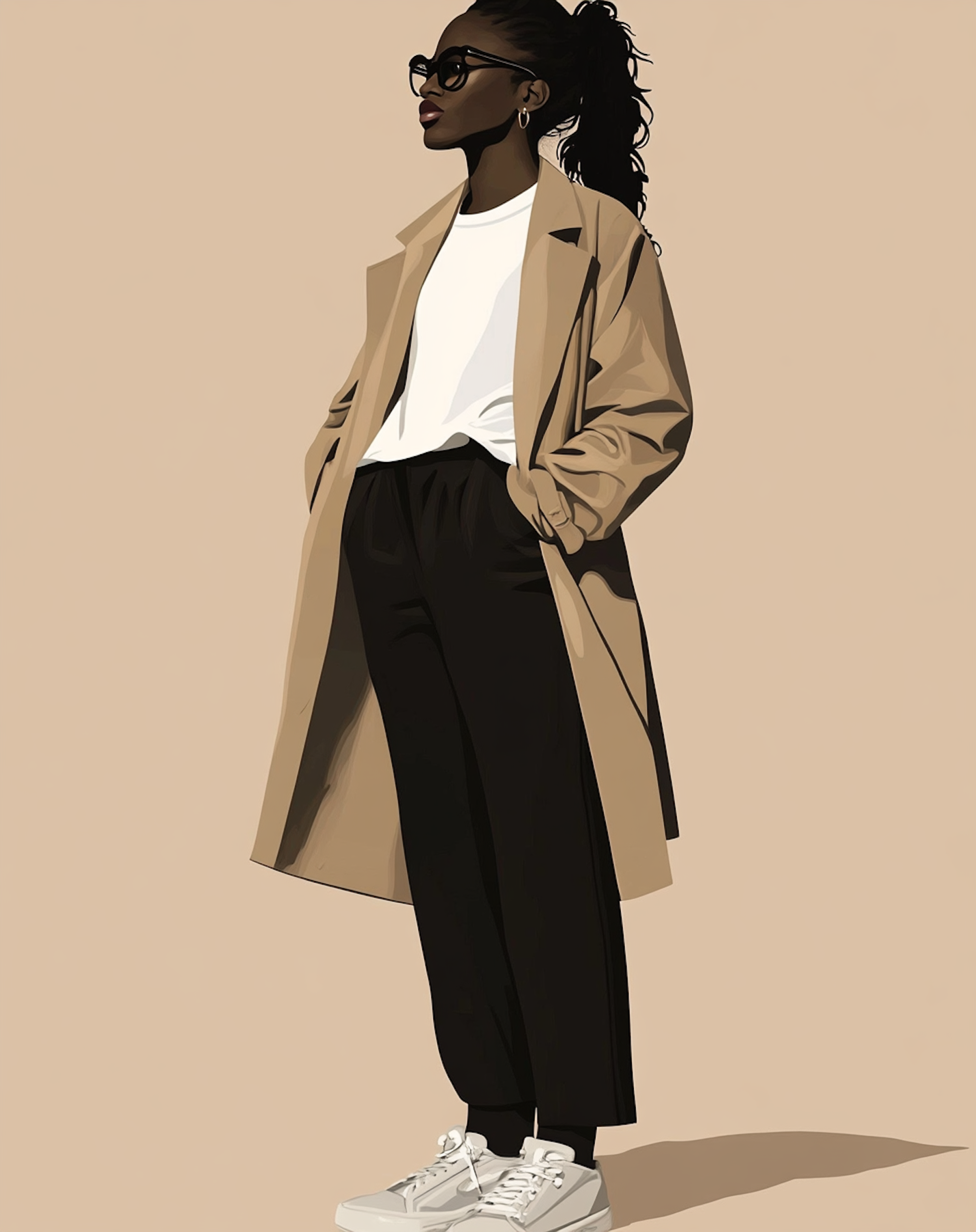 Stylish Black woman in a beige trench coat, white shirt, and black pants, wearing sunglasses and sneakers against a beige background.