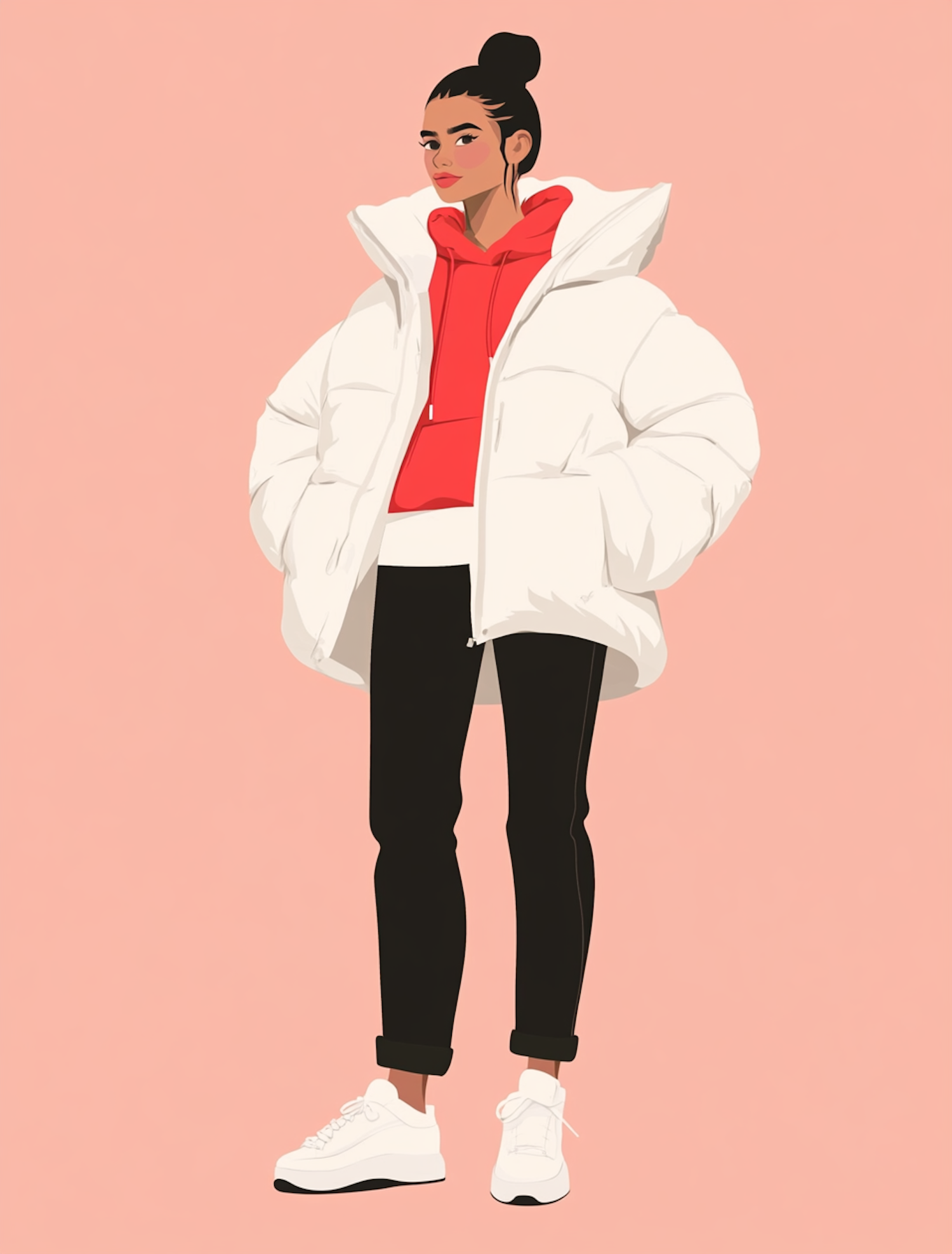 Trendy illustration of a woman in a red hoodie and white puffer jacket, set against a soft pink background.