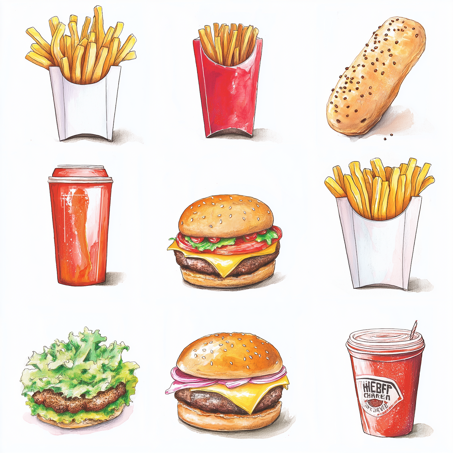 Colorful fast food illustration featuring burgers, fries, and drinks in a 3x3 grid. Perfect for food lovers and menu designs!