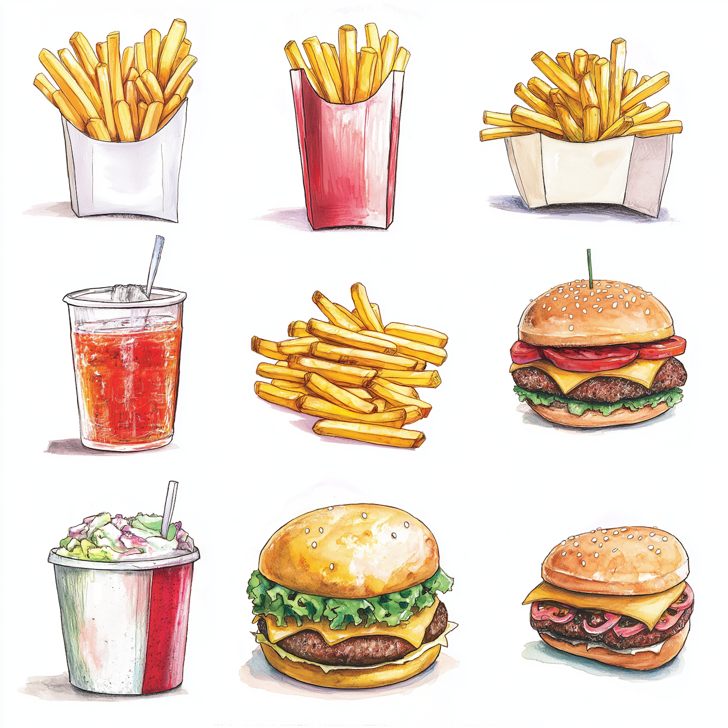 Colorful illustration of French fries, burgers, soda, and dessert in a grid layout. Perfect for fast food lovers and menu designs.