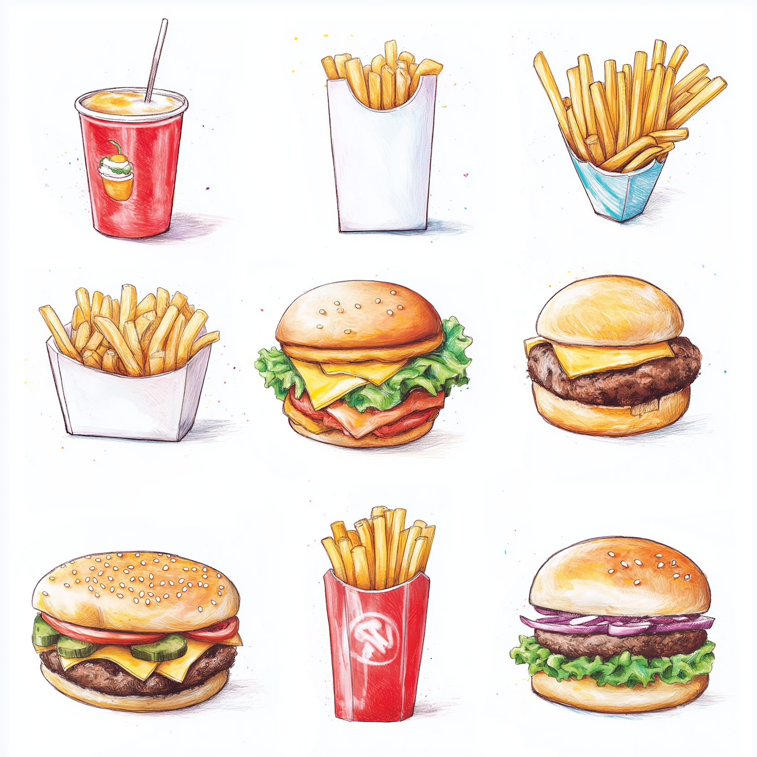 Colorful hand-drawn fast food grid with burgers, fries, and a soda cup. Perfect for food lovers or menu designs!