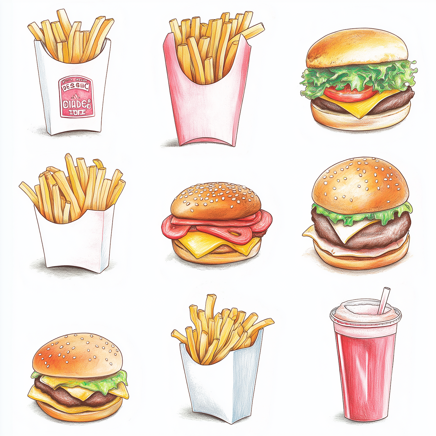 Playful illustration of burgers, fries, and a milkshake in vibrant colors, showcasing classic fast food favorites in a fun grid layout.