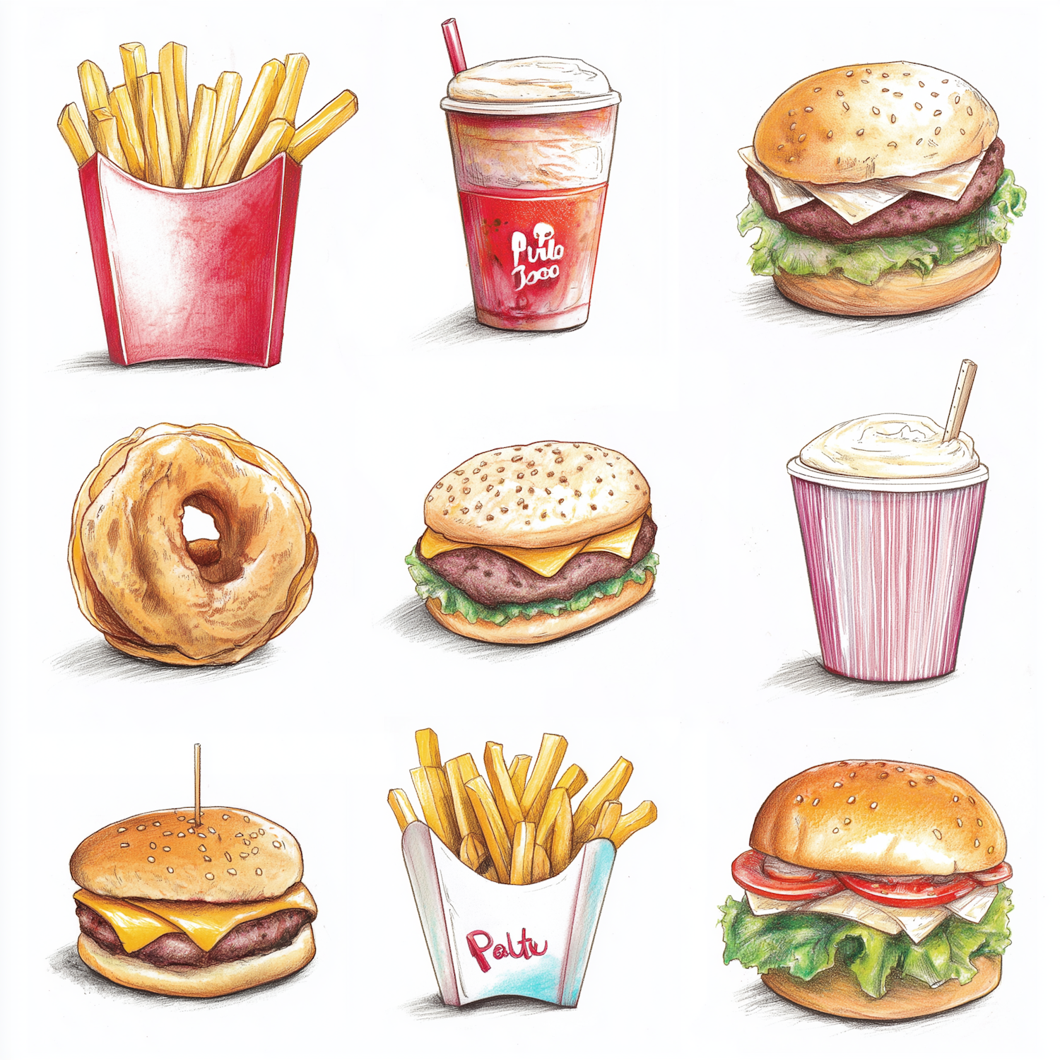 Hand-drawn fast food illustrations featuring burgers, fries, milkshakes, and a donut in a colorful grid layout.