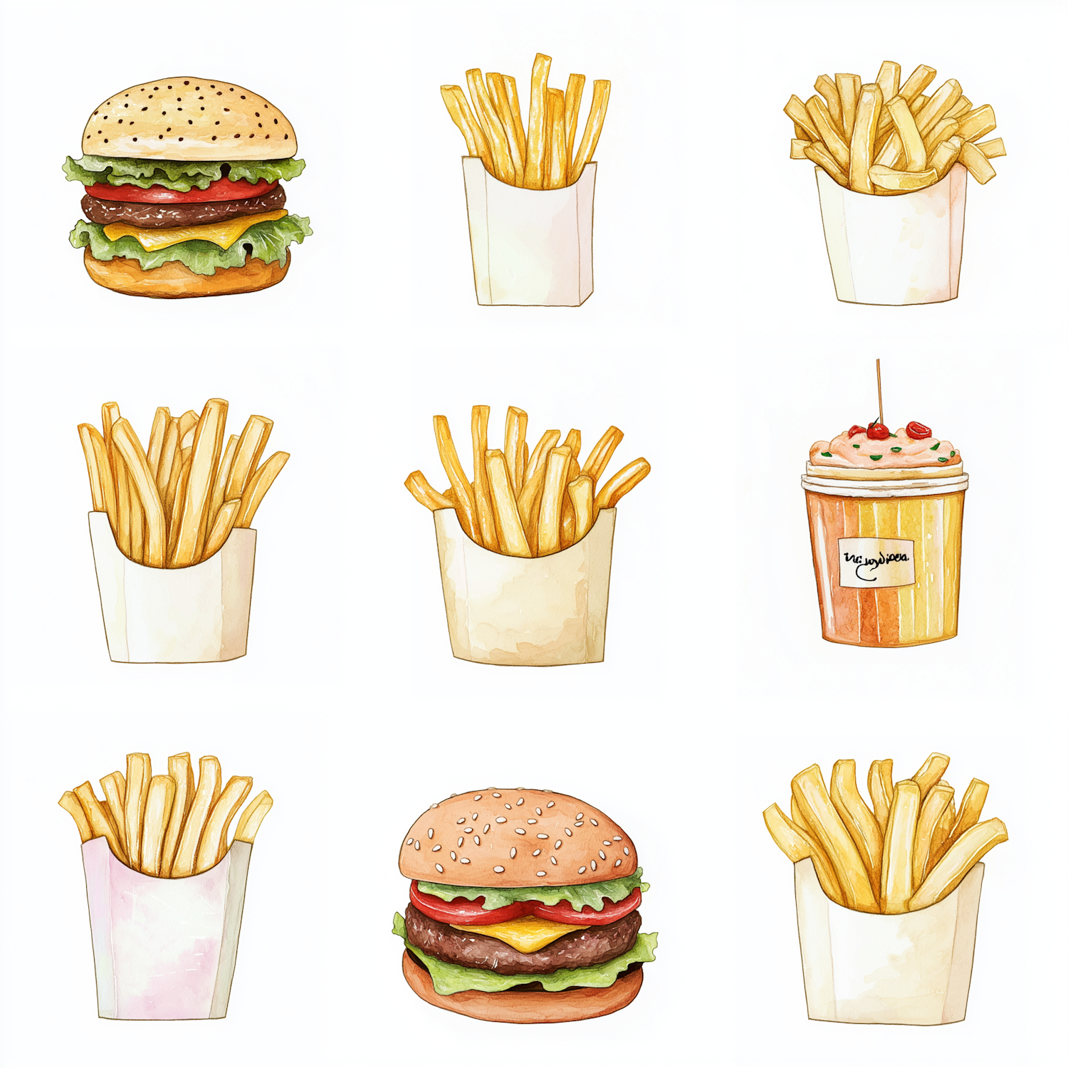 A fun watercolor grid of burgers, fries, and a milkshake. Perfect for fast food lovers or playful food-themed designs.