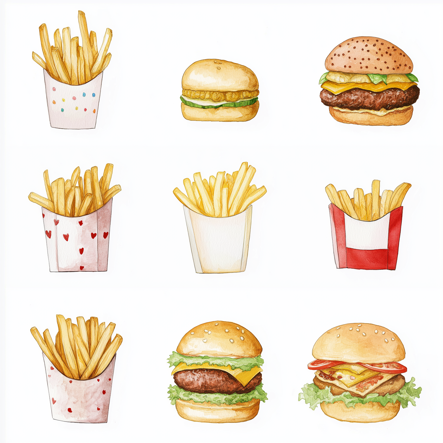 Watercolor illustrations of burgers and fries in a grid layout, showcasing vibrant fast food designs with playful packaging details.