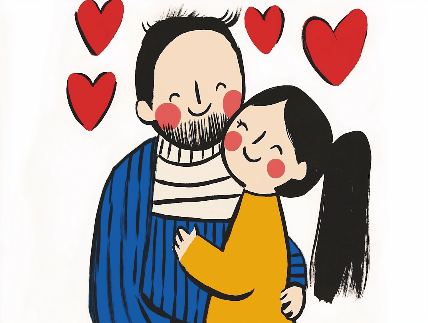 Heartwarming illustration of a father and daughter embracing, surrounded by red hearts, symbolizing love and affection.