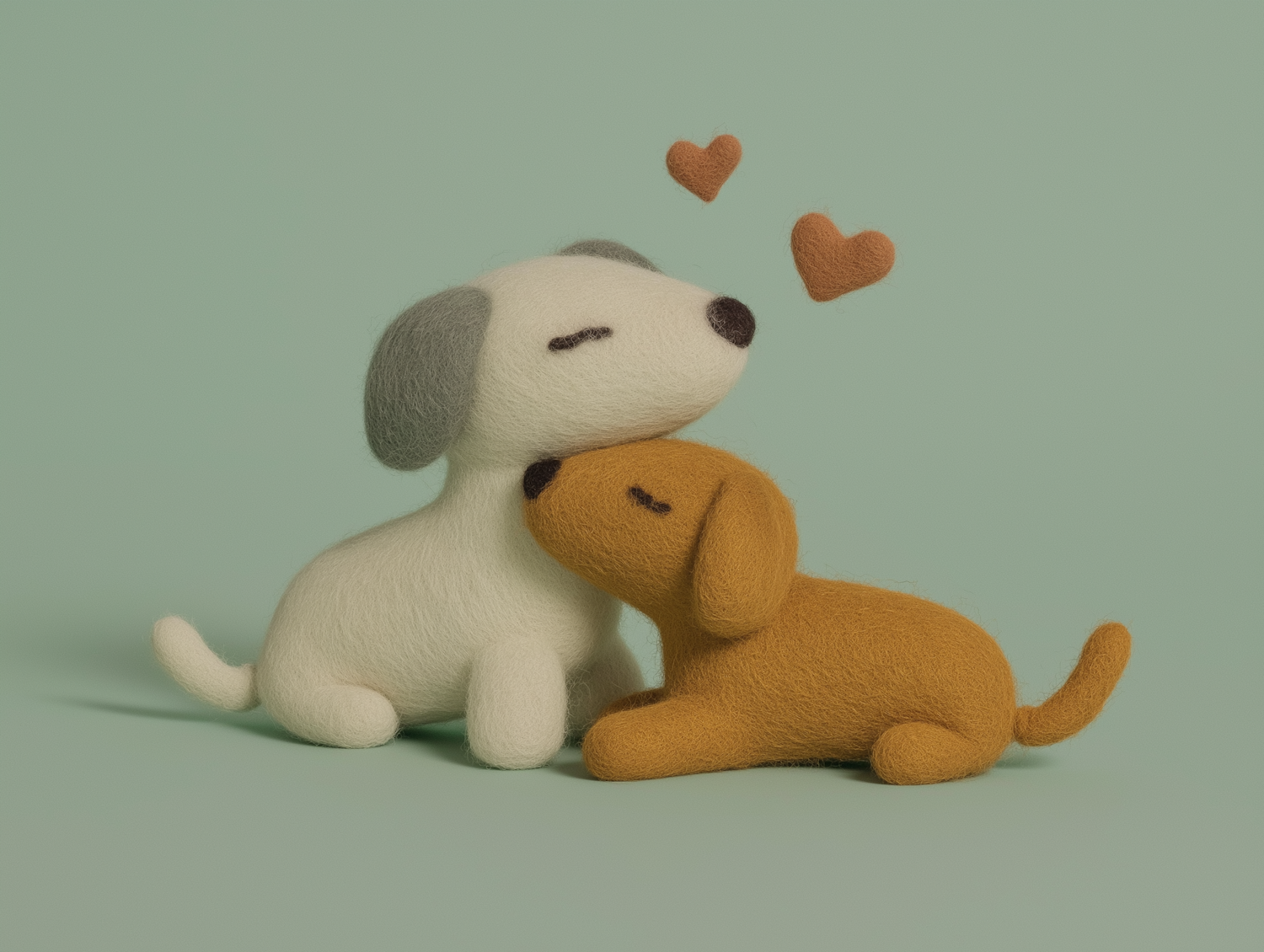 Two felted wool dogs in a loving embrace with floating hearts on a soft green background, symbolizing warmth and companionship.