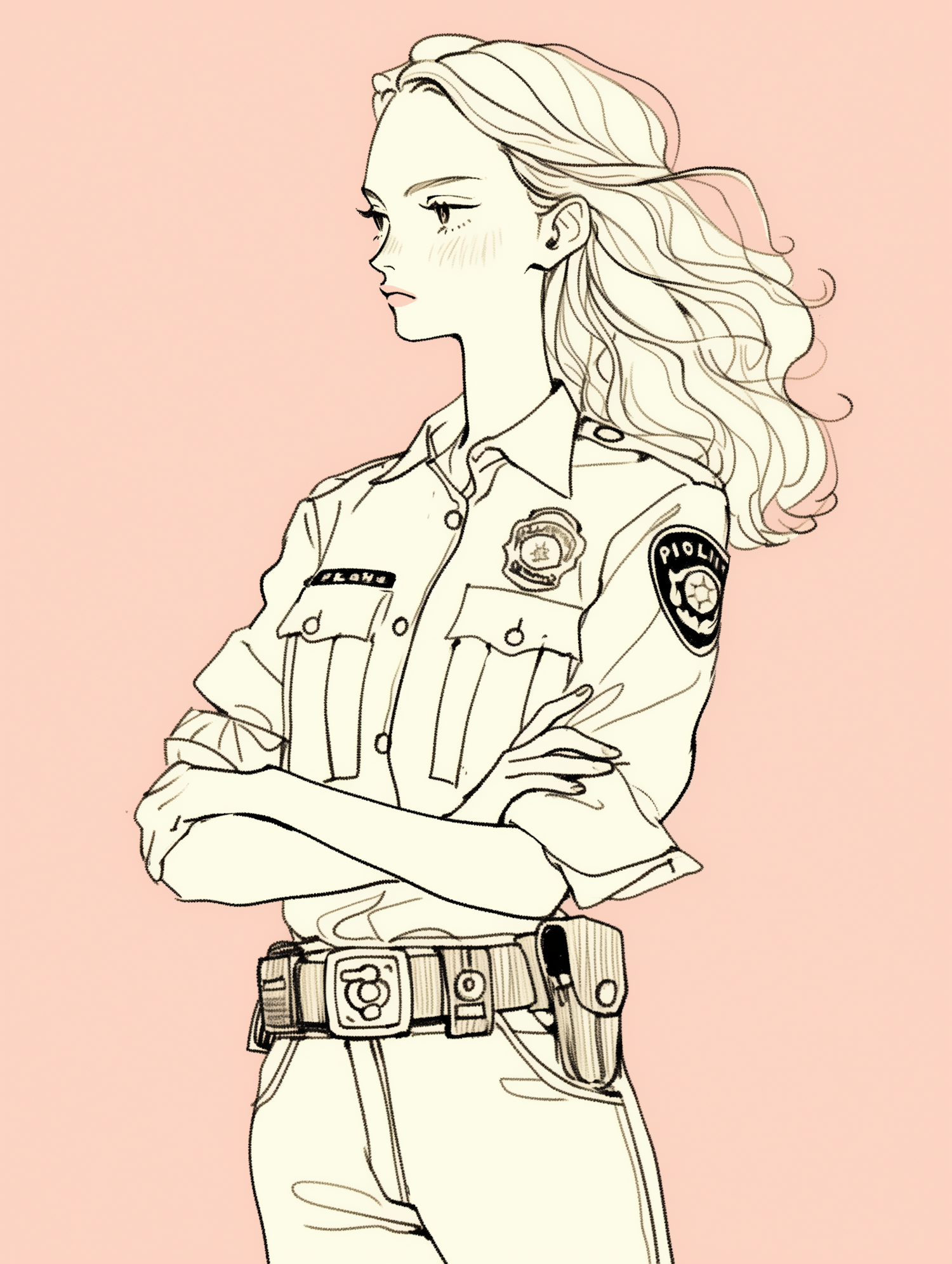 Stylized illustration of a confident female police officer with flowing hair and a determined expression on a peach background.