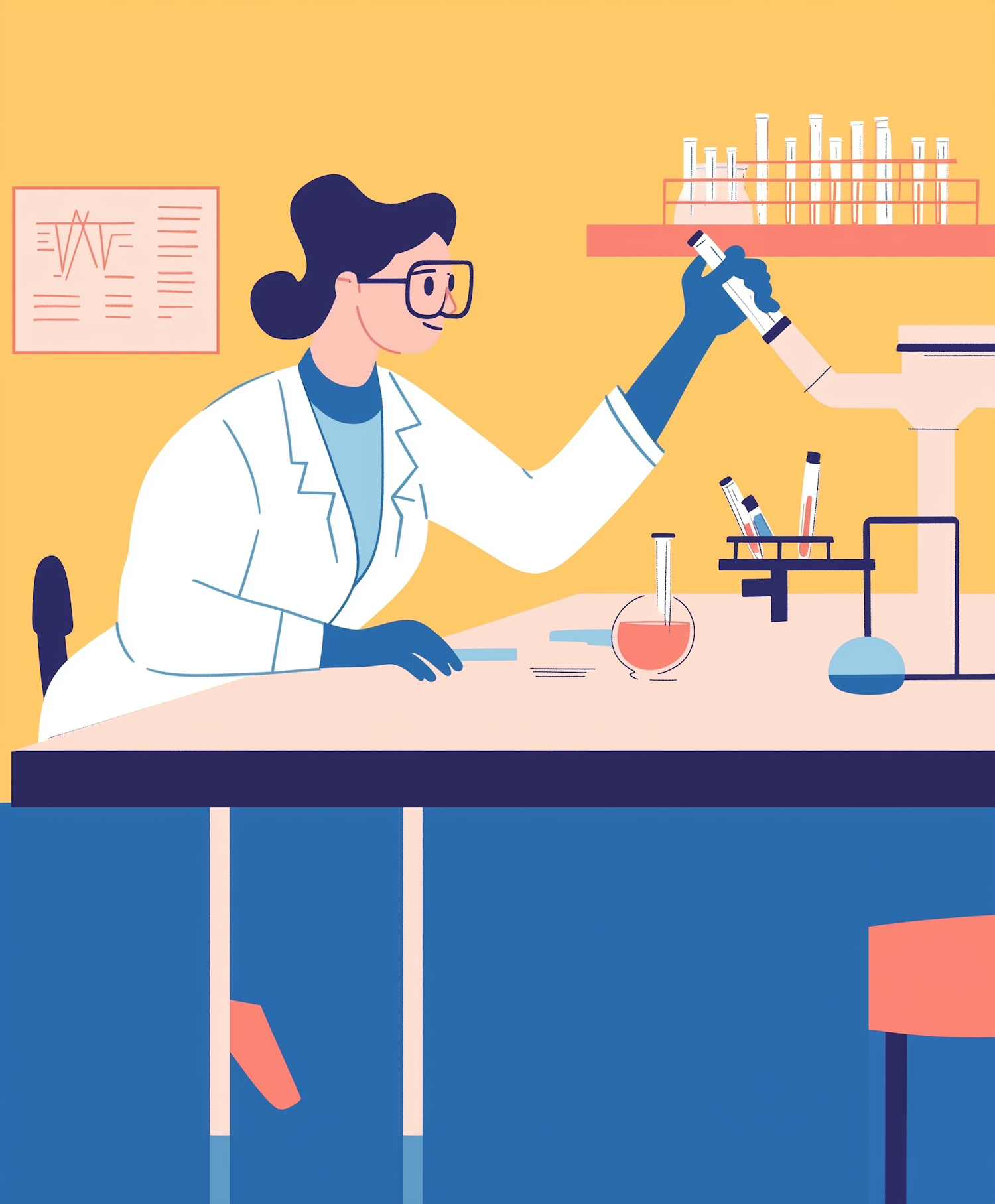 Illustration of a female scientist in a lab, conducting experiments with test tubes and beakers on a bright yellow background.