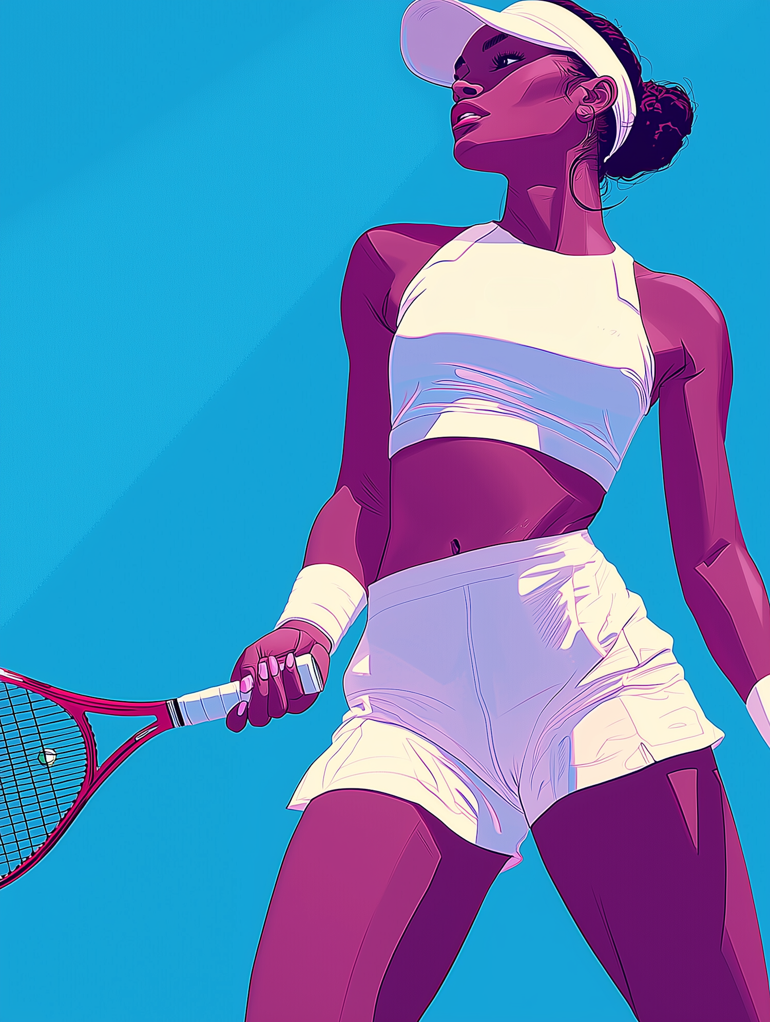 Stylized illustration of a tennis player in white sportswear holding a red racket, set against a vivid blue background.