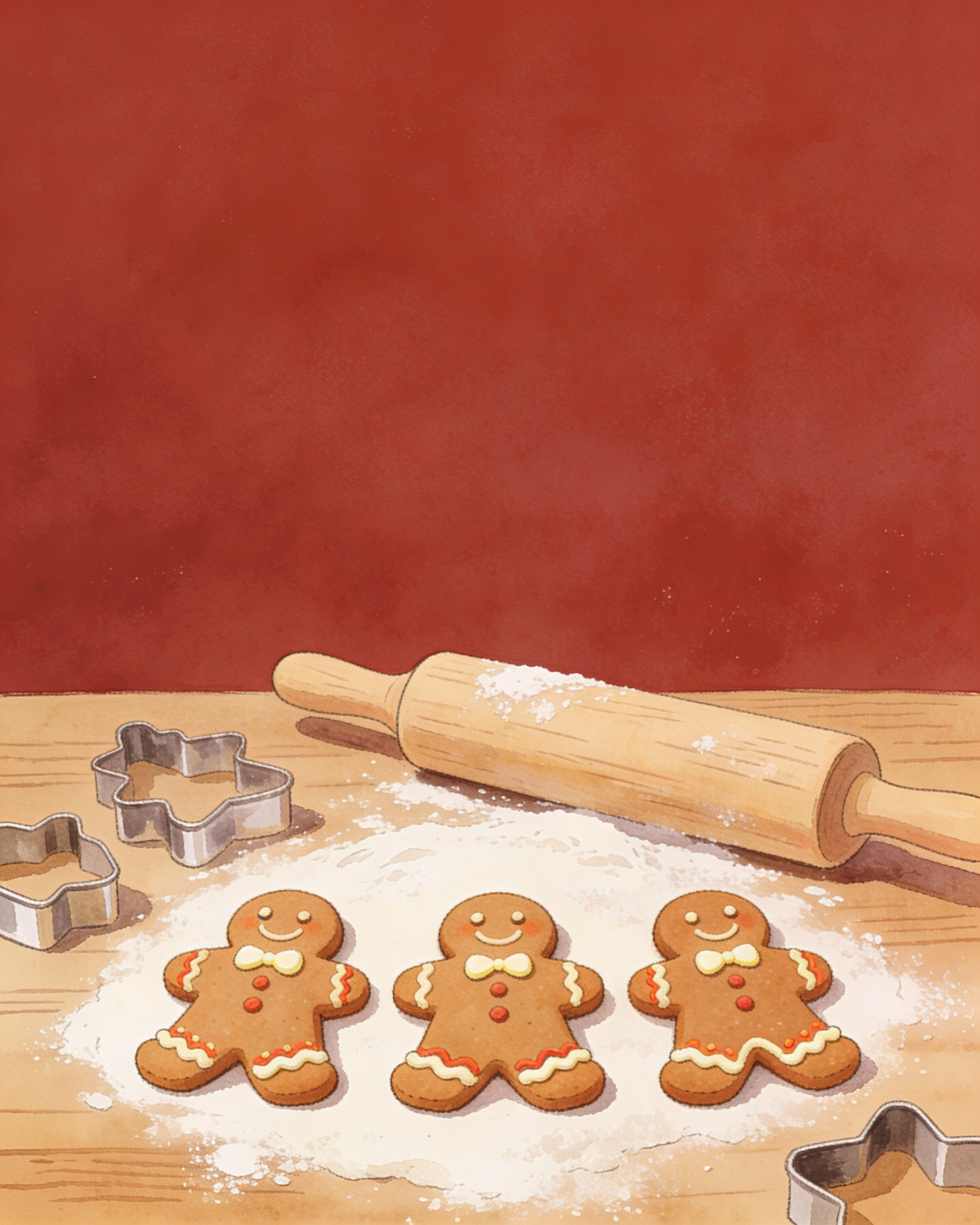 Hand-painted gouache storybook illustration, paper texture, soft edges. Solid deep red background, matte. A simple wooden table with flour, a rolling pin, cookie cutters, and 3 gingerbread men cookies. Cream/ivory icing details, warm gingerbread brown, subtle red-orange accents. Minimal composition, centered, lots of breathing space, no outlines, no gradients.