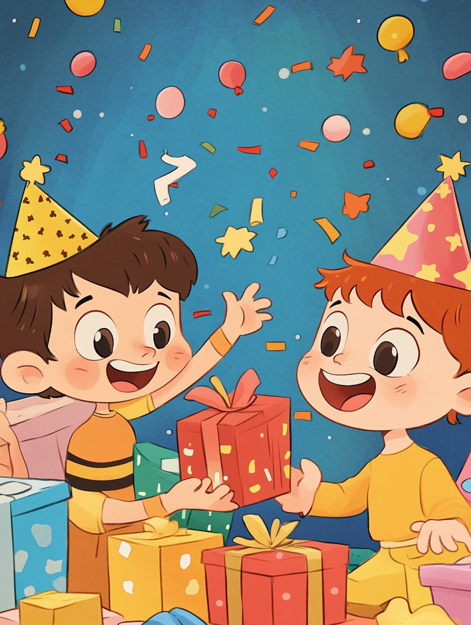 Two animated children celebrating with gifts and confetti, wearing party hats. Bright colors and joyful expressions create a festive scene.