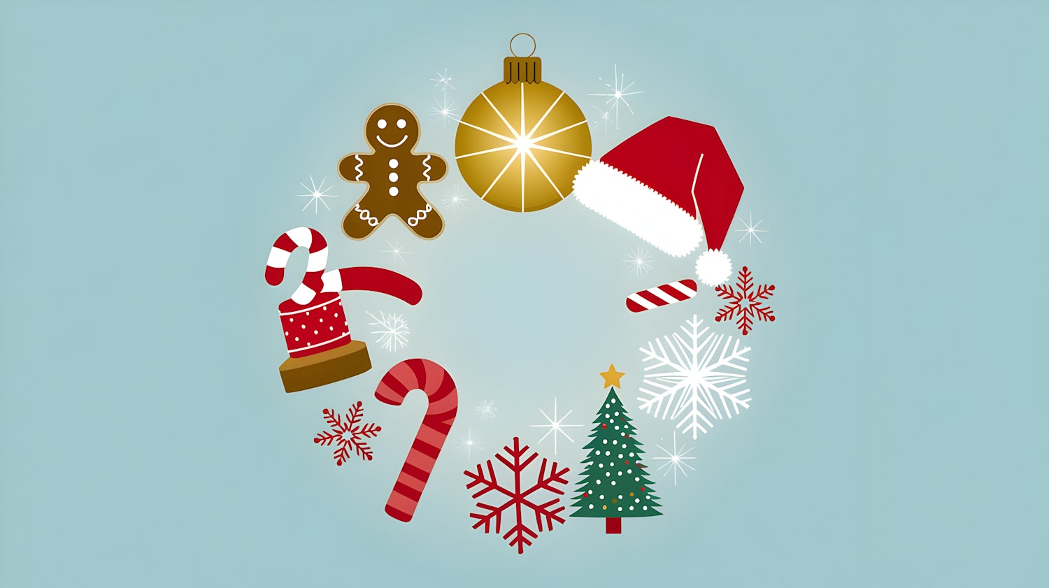 Festive Christmas illustration with gingerbread, ornaments, Santa hat, candy canes, and snowflakes on a light blue background.