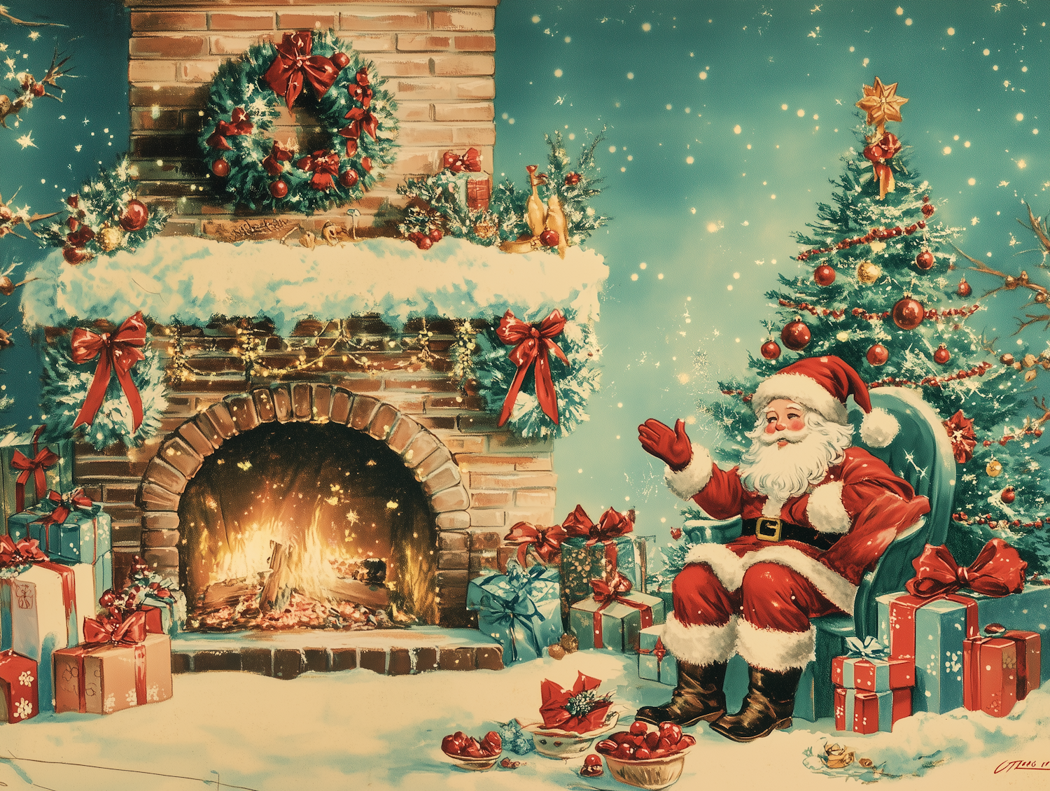 Santa Claus by a cozy fireplace with gifts and a Christmas tree, creating a warm holiday atmosphere.