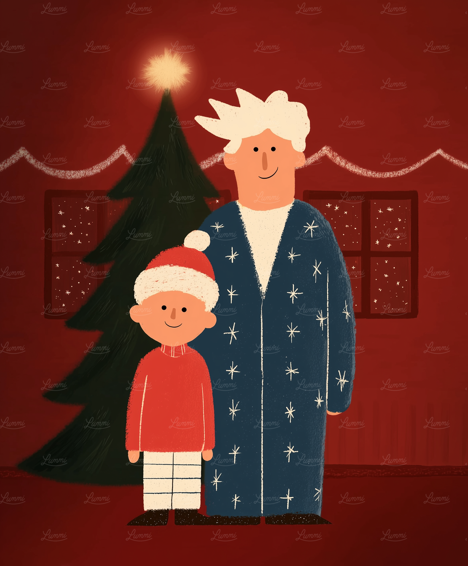 A charming holiday illustration of two characters by a Christmas tree, with warm colors and festive details creating a cozy atmosphere.