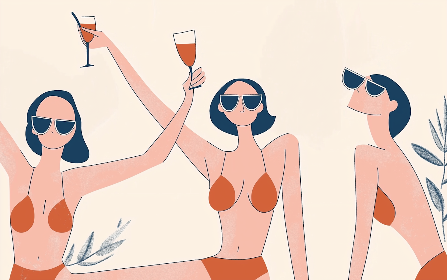 Stylized illustration of three women in bikinis with drinks, celebrating in a minimalist, modern design.