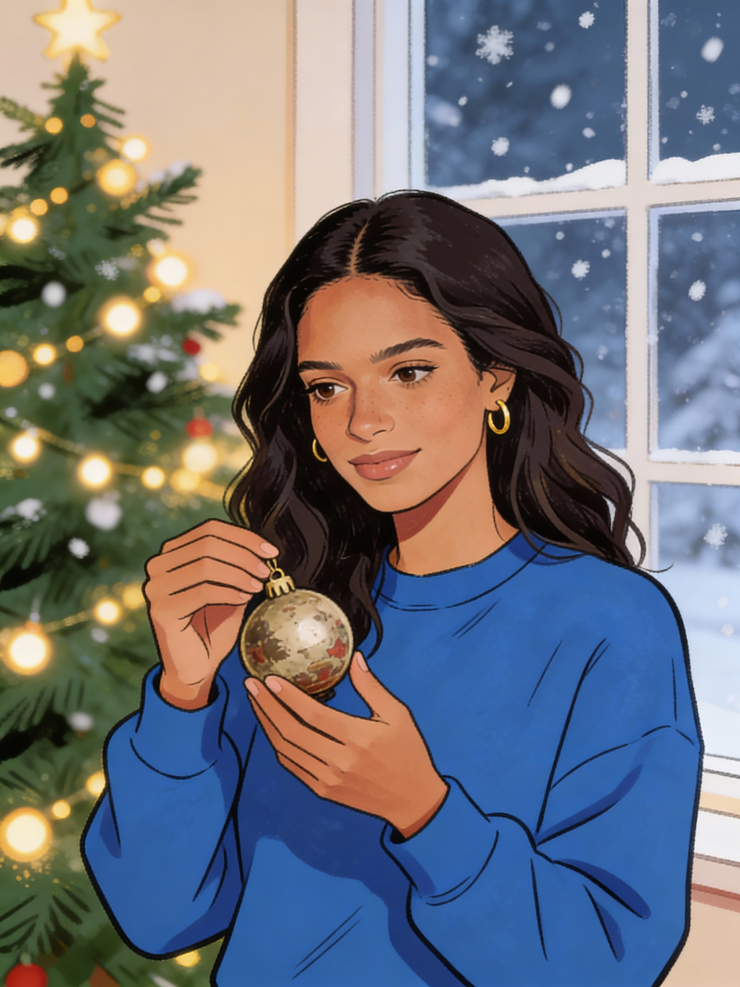 A young woman in a blue sweater decorates a Christmas tree, holding a golden ornament, with a snowy winter scene visible through the window.