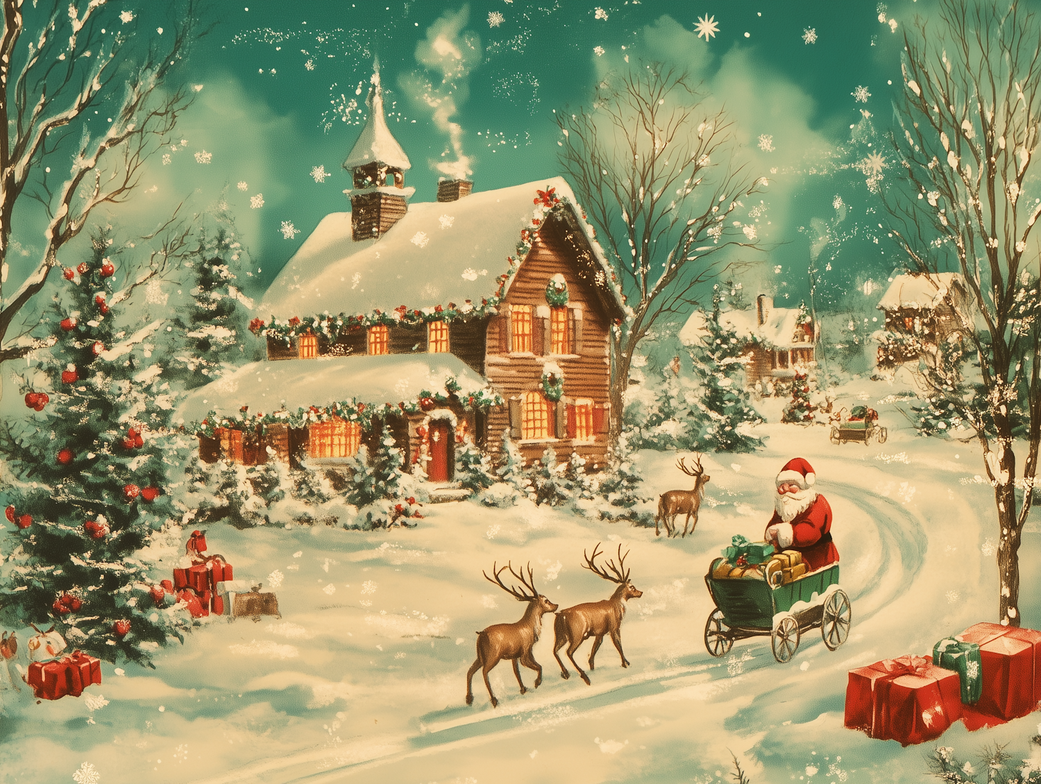 Festive Winter Scene with Santa and Reindeer