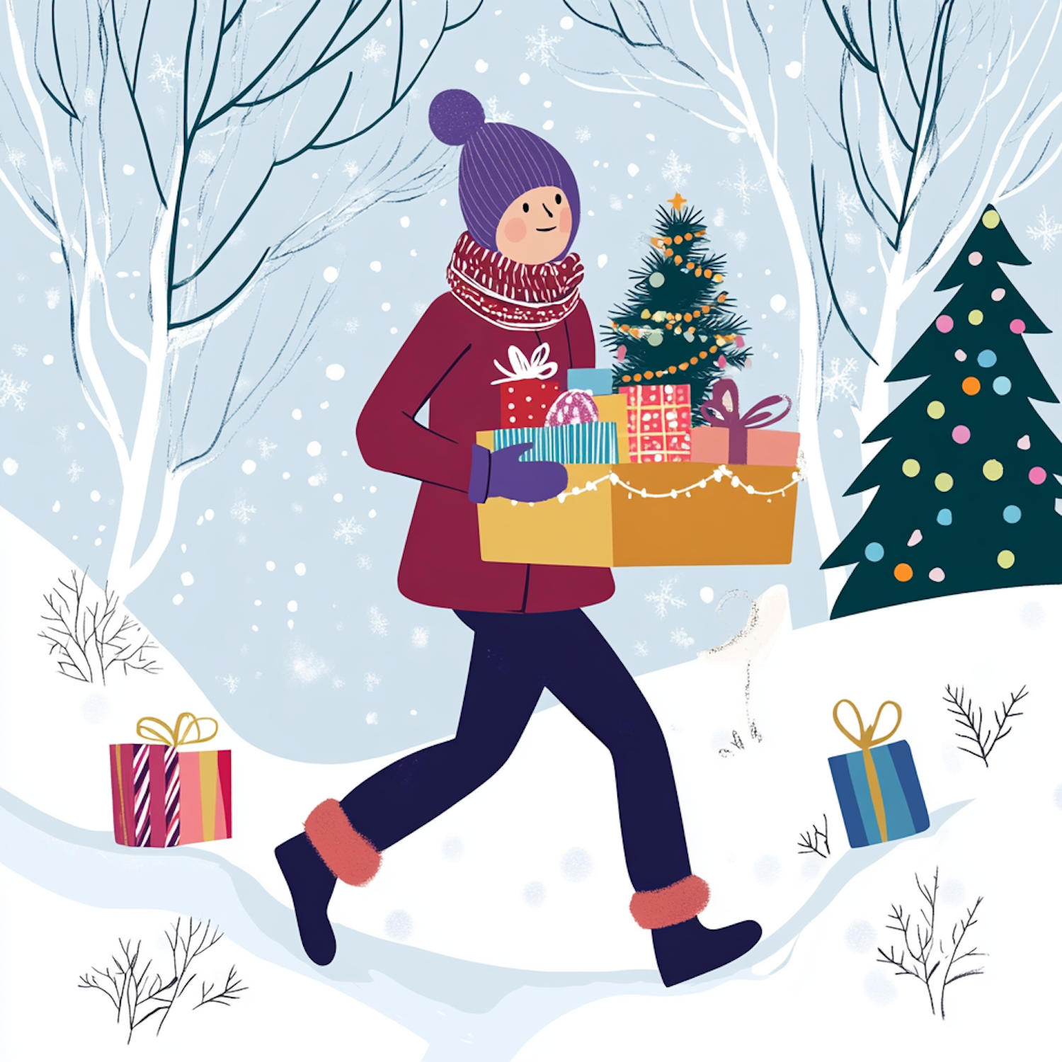 Festive winter illustration of a person carrying gifts and a Christmas tree in a snowy landscape with decorated trees and falling snow.