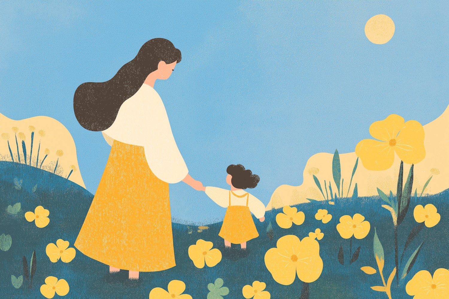 A heartwarming illustration of a woman and child walking through a sunny field of yellow flowers, evoking warmth and connection.