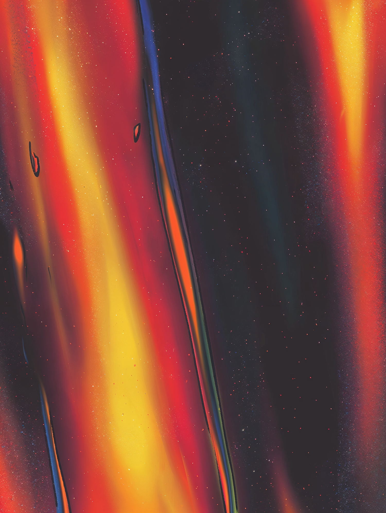 Abstract art with fiery red, orange, and yellow streaks on a dark starry background, blending cosmic and molten lava vibes.