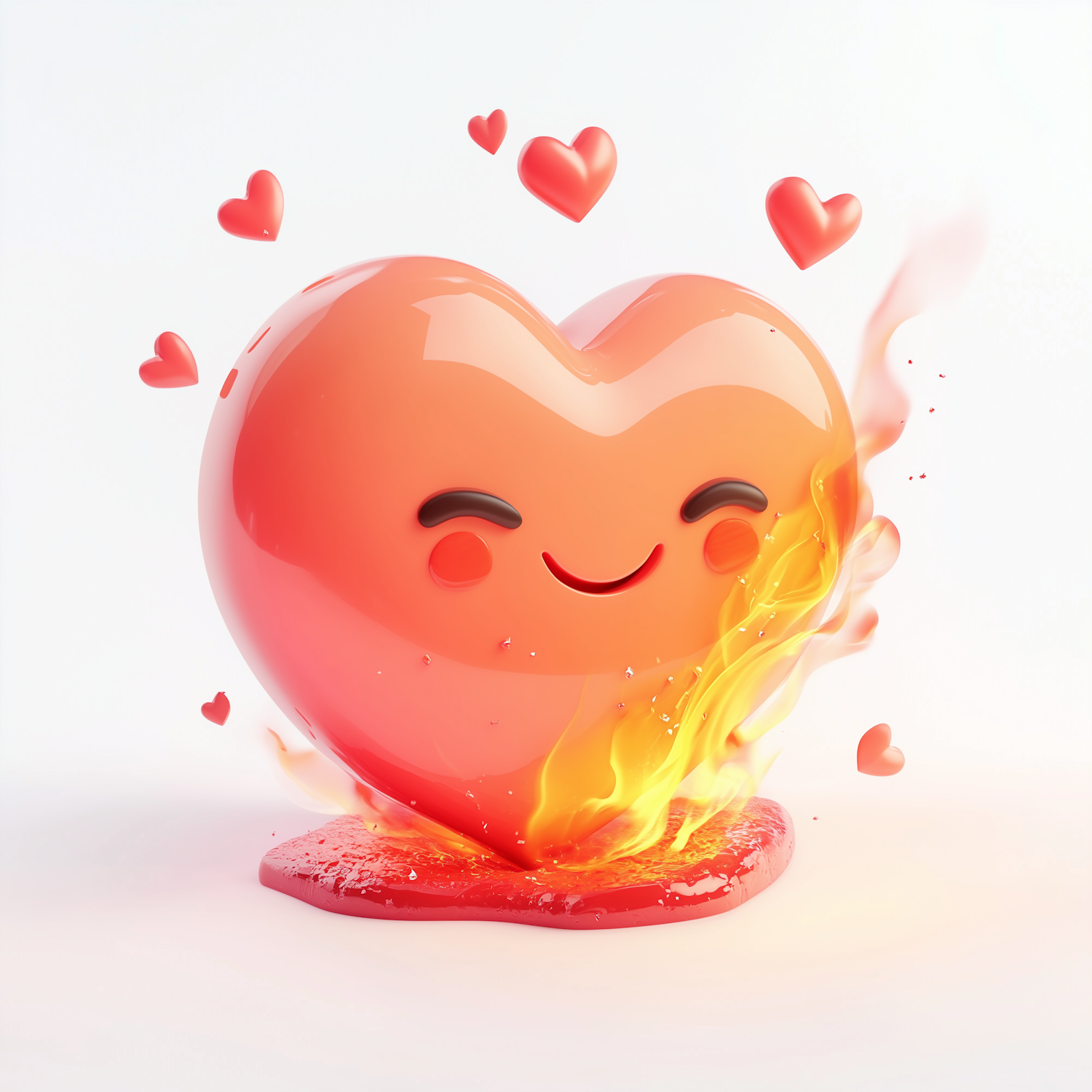 A cute, smiling heart with flames and floating hearts on a white background, creating a playful and vibrant scene.
