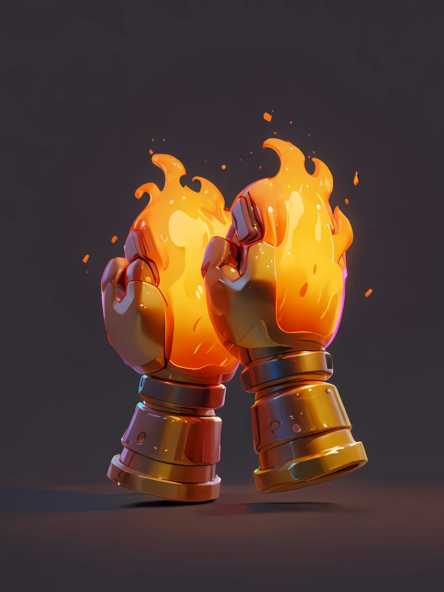 Fiery 3D gauntlets with glowing flames and a polished metallic finish, set against a dark background for a dramatic effect.