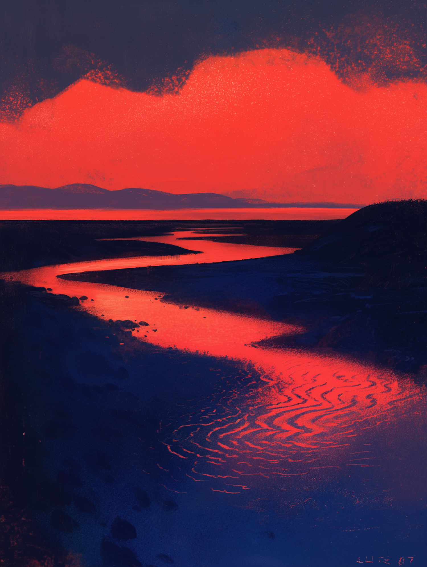 A stunning illustration of a winding river reflecting a fiery red sky, with contrasting dark blue terrain and distant silhouetted hills.