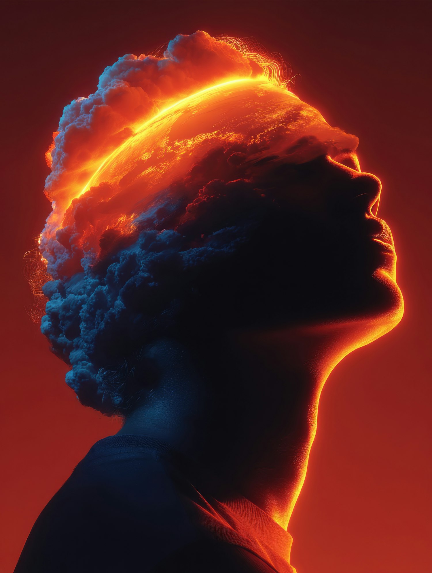 A stunning surreal illustration of a human silhouette intertwined with fiery light and stormy cloud effects, evoking thought and awe.