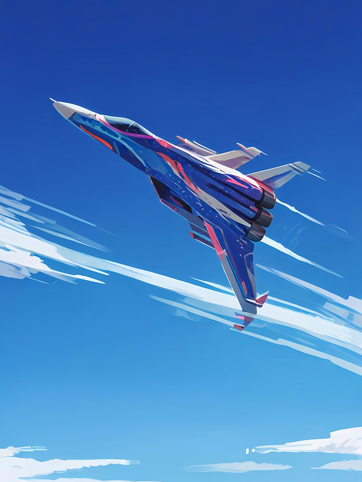 A colorful fighter jet with a futuristic design ascends through a vibrant blue sky, leaving streaks of contrails behind.