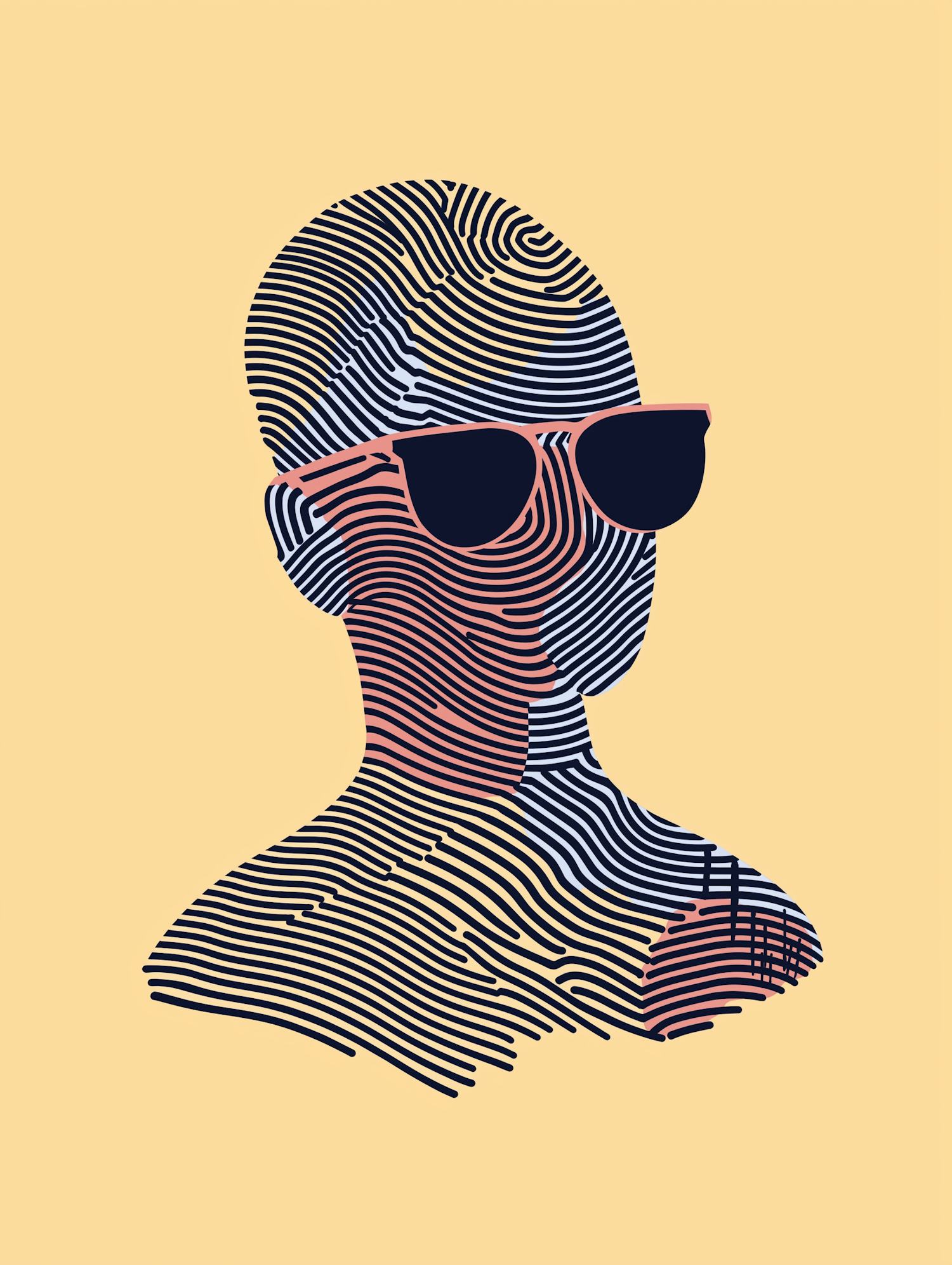 Abstract illustration of a human bust with fingerprint-like lines and sunglasses on a yellow background.