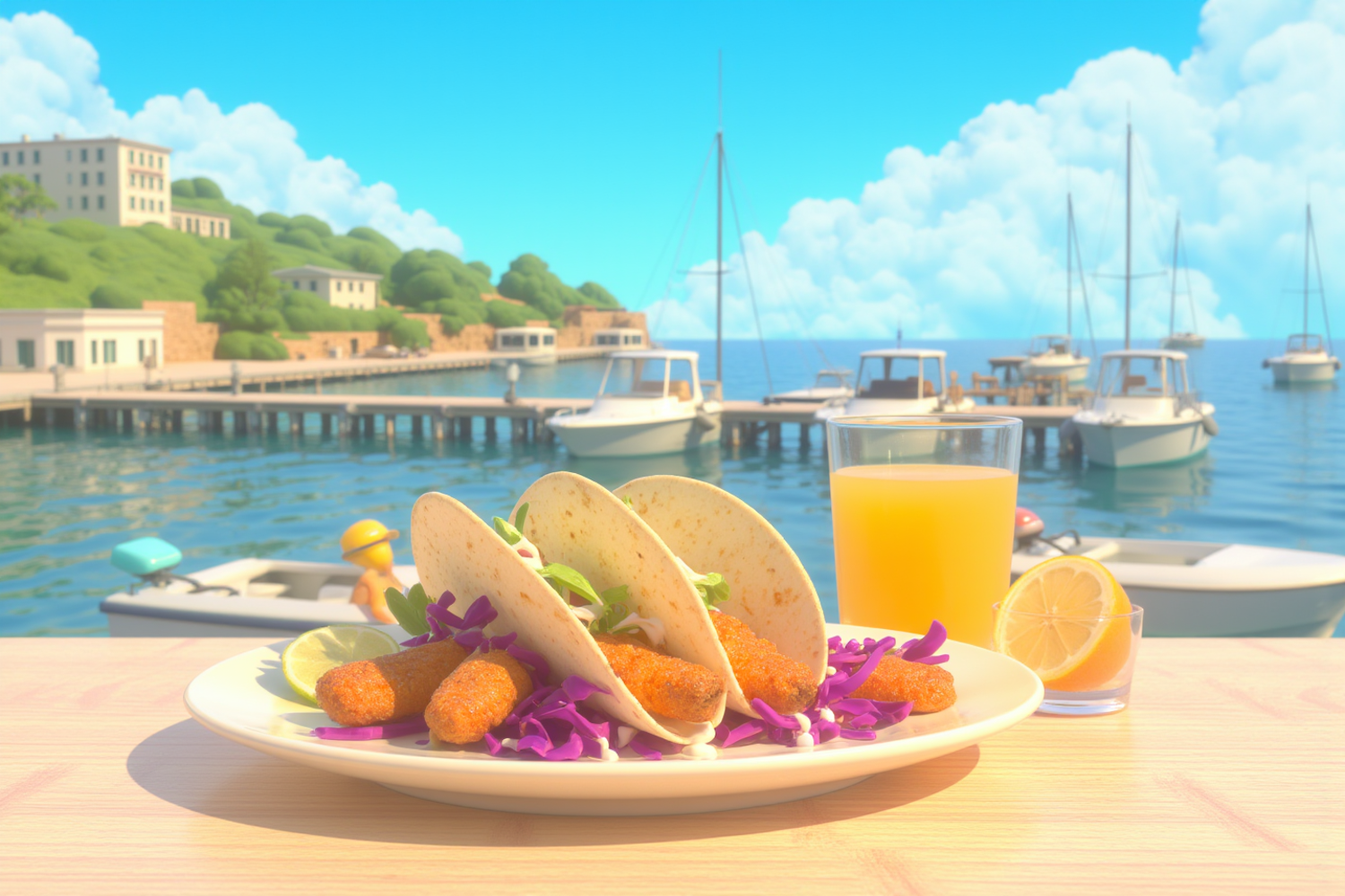 Delicious fish tacos with vibrant garnishes, served with orange juice, set against a serene marina backdrop on a sunny day.